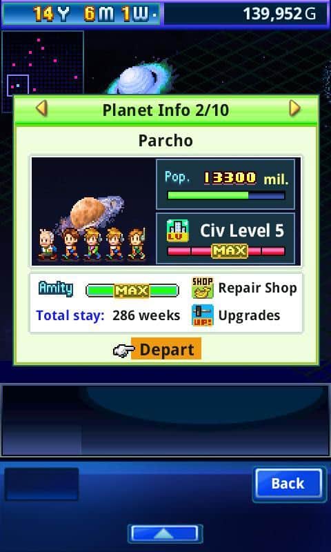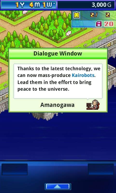 Kairobotica - симулятор на андроид от студии Kairosoft. В этой игре вам предстоит построить свой космический город. Строим дома, развиваем инфраструктуру и создаём огромный космический мегаполис. Сражаемся со злодеями, помогаем соседним дружественным планетам отбиваться от разбойников. У вас появиться возможность самому написать межпланетную историю, в которой ваш город играл немаловажную роль.
