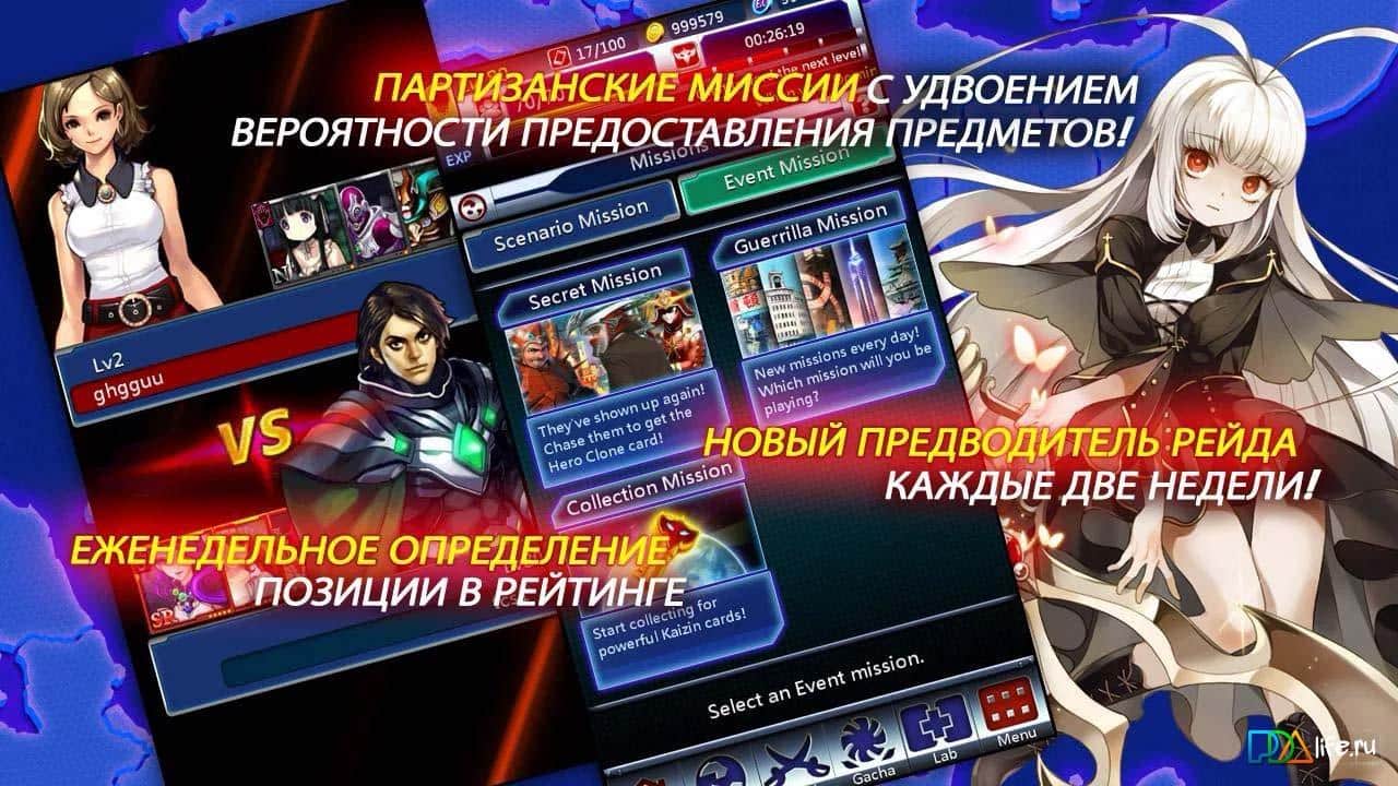Kaizin Rumble - Отличная карточная РПГ на андроид, которая порадует вас оживленными боями. Выберите одну из враждующих сторон, собирайте карты, и вступите в жестокий бой. У вас так же есть возможность улучшать характеристику своих героев. В игре очень увлекательный геймплей, который понравится всем поклонникам таких игр. Так же 4 раза в сутки вас ждет командные бои, за которую вы сможете получить хорошую награду.