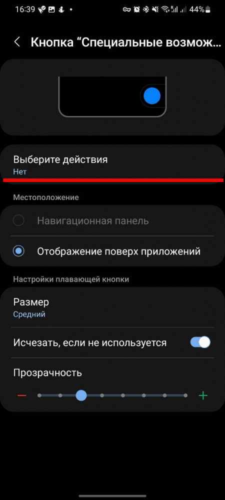 Чтобы включить меню, переходим по пути Настройки — Специальные возможности — Дополнительные параметры — Кнопка “Специальные возможности”. Здесь в разделе “Выберите действие” отмечаем галочками те опции, которые вам нужны и возвращаемся на шаг назад, чтобы выбрать желаемое положение и размер для созданной панели. Для этого обращаемся к подразделам “Размер” и “Прозрачность,” где нужно выбрать комфортные для пользователя значения.