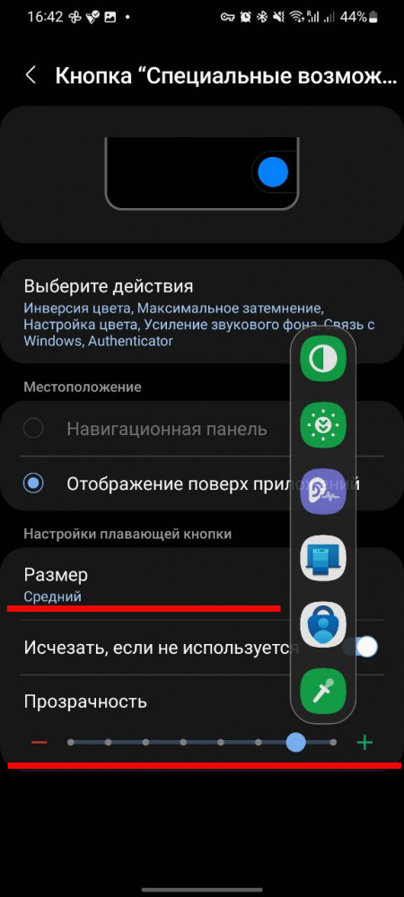 Выбранные вами опции будут доступны в виде небольшого плавающего окна или кнопки, доступных на любом экране. Предусмотрена возможность менять прозрачность элементов, а также их размер.