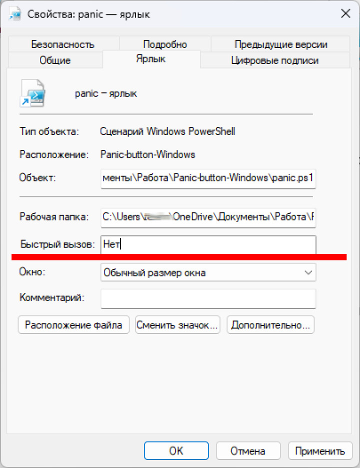Если вы уже определились с желаемым сценарием, пора заставить наш скрипт работать по одному нажатию. Для этого запускаем Блокнот и вставляем туда выбранный код. Этот файл нужно будет сохранить с расширением .ps1 — например, panic.ps1. Далее вызываем контекстное меню и создаем ярлык. В свойствах ярлыка назначаем сочетание клавиш, которое будет запускать команду. Дело сделано, наслаждаемся.