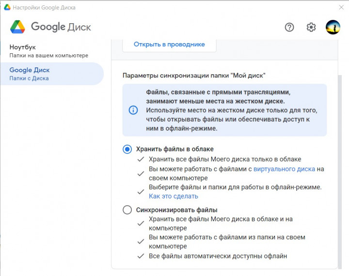 Облачное хранилище от Google предлагает два варианта синхронизации: хранение данных в облаке и создание виртуального диска или же полная копия всех данных Google Drive.