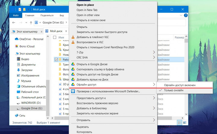 Допустим, вам не нужна полная синхронизация Диска, но состояние некоторых папок всегда должно быть актуальным. Для этого из Проводника выбираем интересующую папку или файл, вызываем контекстное меню и ставим галочку напротив пункта “Офлайн-доступ”. Теперь эти данные будут синхронизироваться, независимо от выбранных ранее настроек.