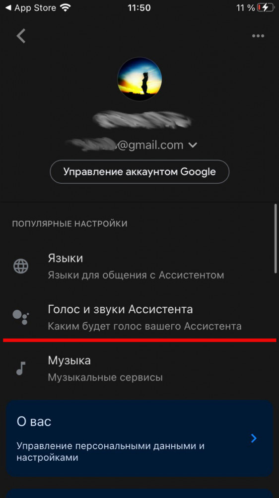 На яблочной операционке элементы интерфейса сохраняют уже знакомые названия, но располагаются чуть иначе: вызываем Ассистент — Профиль — Голос и звуки Ассистента.