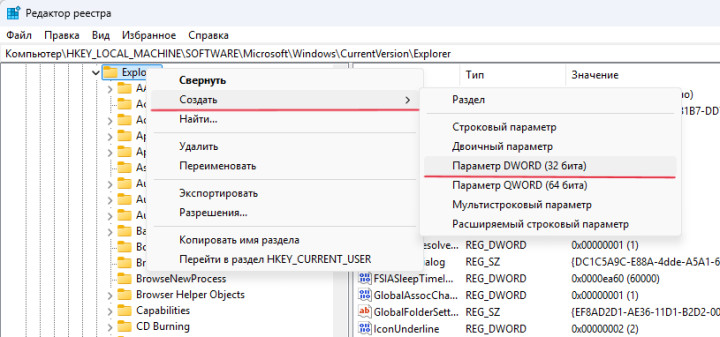 В левой панели на папке Explorer вызываем контекстное меню — Создать — Параметр DWORD (32 бита). Новый параметр будет называться