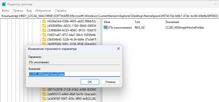 Если в будущем вы захотите восстановить функцию, удалите параметр HubMode и создайте заново папку {f874310e-b6b7-47dc-bc84-b9e6b38f5903}. Здесь дважды щелкните строку «По умолчанию» ключа справа, введите
