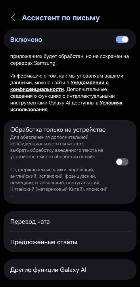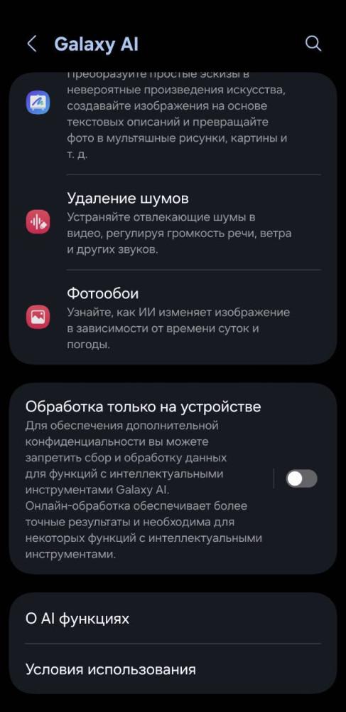 Тапнув на название заинтересовавшего вас модуля, вы попадете к списку его настроек — для каждого пункта опции будут отличаться. Справа вверху вы найдете тумблер, который отключит модуль полностью. Вы также можете ограничить количество данных, попадающих в облако. Для этого активируйте переключатель “Обработка только на устройстве” — он доступен как для всех ИИ-функций, так и для отдельных модулей. Обратите внимание, некоторые опции в таком режиме будут недоступны.