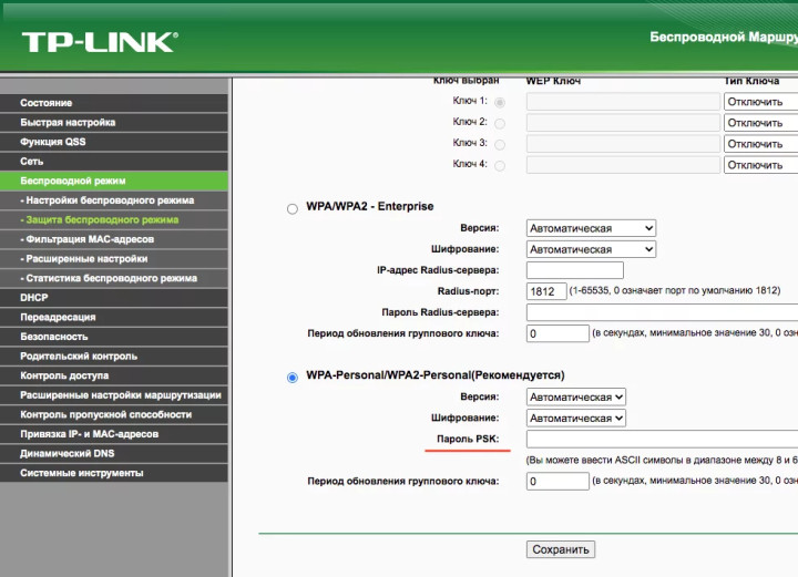 Самый простой вариант — сменить пароль от домашней сети. После этого вам нужно будет заново подключить все ваши устройства, а вот у вашего злоумышленника такой возможности уже не будет. Используем браузер, чтобы открыть настройки роутера, вводим логин и пароль администратора и переходим по пути Беспроводной режим — Защита беспроводного режима — Пароль. Обратите внимание, в зависимости от того, маршрутизатор какого производителя вы используете, путь и элементы интерфейса могут отличаться.