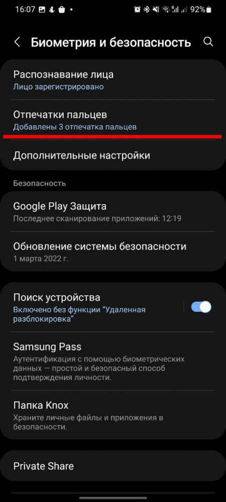 Переходим в Настройки — Биометрия и безопасность — Отпечатки пальцев. Чтобы попасть в следующий раздел, вам нужно будет подтвердить свою личность при помощи графического ключа. Чтобы отключить дактилоскопический сенсор на выключенном экране полностью, находим строку “Всегда распознавать отпечатки” и деактивируем его. В таком режиме сканер отпечатков пальцев будет откликаться на прикосновения в том случае, если вы предварительно пробудили экран.