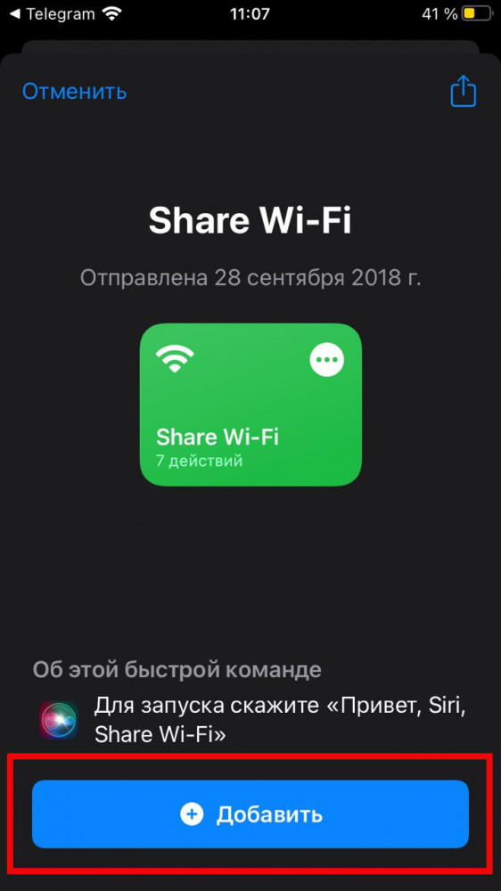 Первым делом, проверьте, установлены ли у вас Быстрые команды, если нет, их всегда можно найти в AppStore. Далее находим собственно команду Share Wi-Fi, она доступна по ссылке. В открывшемся окне нажимаем “Добавить”, после чего переходим к самому приложению. В программе Быстрые команды переходим во вкладку “Мои команды” и находим Share Wi-Fi.