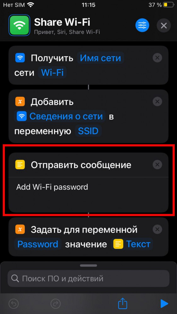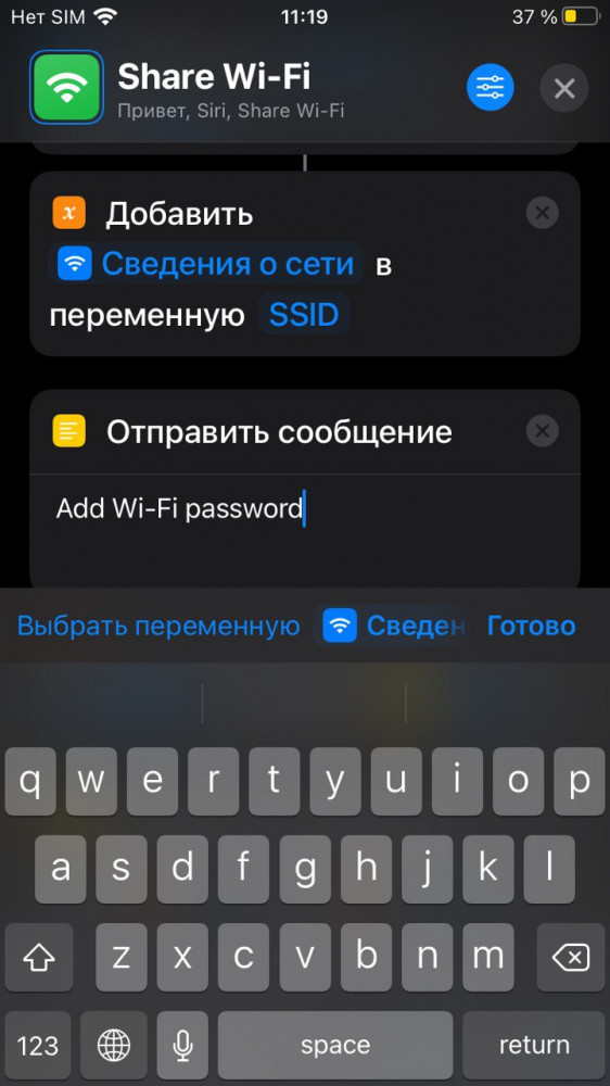 Вызываем меню для настройки нашего ярлыка, для этого нажимаем на три точки в правом верхнем углу плитки. В открывшемся окне находим раздел “Отправить сообщение” и вместо Add Wi-Fi password вписываем в него собственно пароль от сети, к которой вы хотите подключить ваших гостей. Далее нажимаем Готово и закрываем меню настройки ярлыка при помощи крестика в правом верхнем углу.