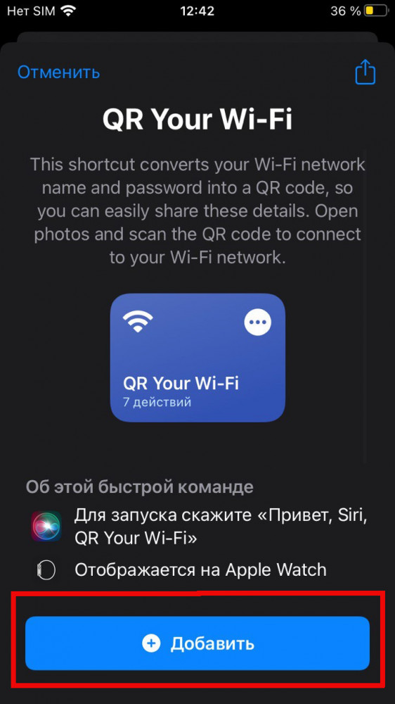 Аналогичным образом работает другой ярлык, QR Your Wi-Fi. Проще всего найти его непосредственно через поиск приложения Быстрые команды. Добавляем к списку своих команд, а при первом запуске вписываем название домашней сети и пароль от нее. Далее также, как в варианте выше, запускаем ярлык и предлагаем гостям считать сгенерированный код.