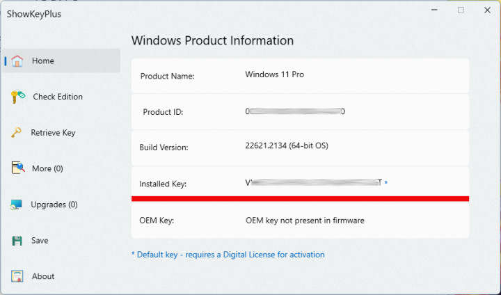 ShowKeyPlus также является очень лаконичной программой, но в отличие от варианта выше, она покажет не только текущий ключ продукта, но и OEM-лицензию, если вы использовали ее ранее.
