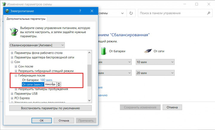 Чтобы настроить время, по истечении которого ваш компьютер отправится в гибернацию, вам нужно запустить Панель управления любым удобным способом и выбрать раздел “Электропитание”. Здесь напротив пункта “Выбранная схема” выбираем “Настройка схемы электропитания”, а в открывшемся окне — “Изменить дополнительные параметры питания”. В новом окне выбираем “Сон”, а потом “Гибернация после”. Если вы используете ноутбук, здесь вы найдете два переключателя: для режима работы от аккумулятора и от электросети. Вы можете указать любое время, в том числе, возможность никогда не переводить ПК в режим гибернации.