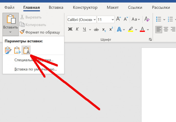 Точно также работает кнопка “Вставить” в левом верхнем углу. Вновь кликаем на иконку, отмеченную буквой “А”, чтобы сохранить текст без форматирования.