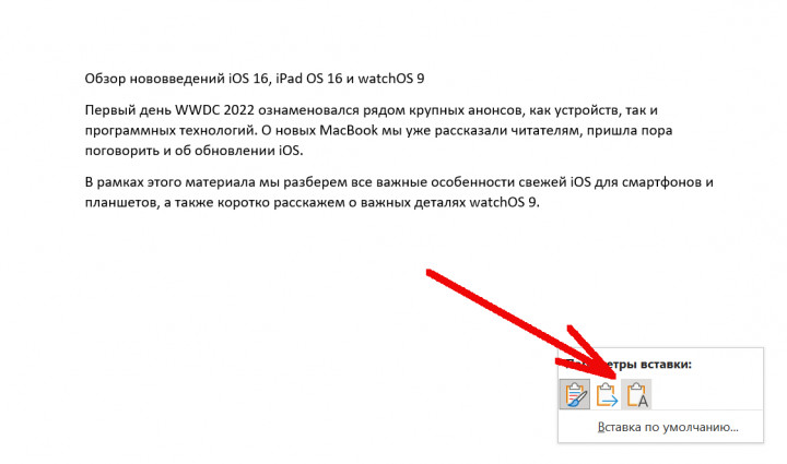 Для начала, обратите внимание на контекстное меню. Здесь выбираем Параметры вставки и вариант помеченный буквой “А”, то есть вставить только текст. Это подменю также появляется на несколько секунд когда вы вставляете фрагмент комбинацией клавиш Ctrl+V и в нем также можно выбрать вставку текста без форматирования.