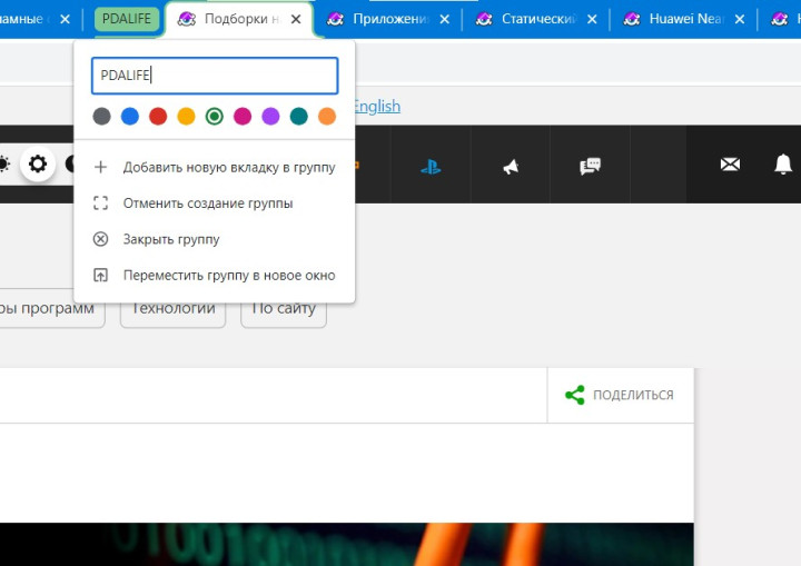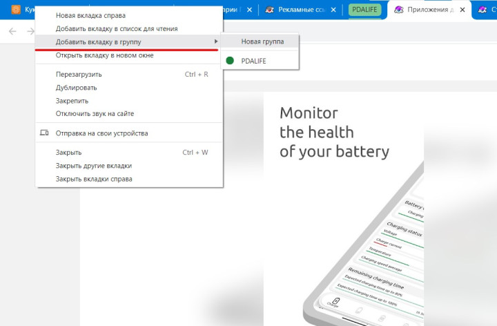 Чтобы создать группу, вызываем контекстное меню на одной из интересующих вкладок и выбираем пункт “Добавить вкладку в новую группу”. При создании присваиваем группе название и цвет, а после сохранения вы сможете работать с группой так же, как в одной вкладкой: есть возможность закрыть все страницы внутри одной группы или перенести их в отдельное окно.