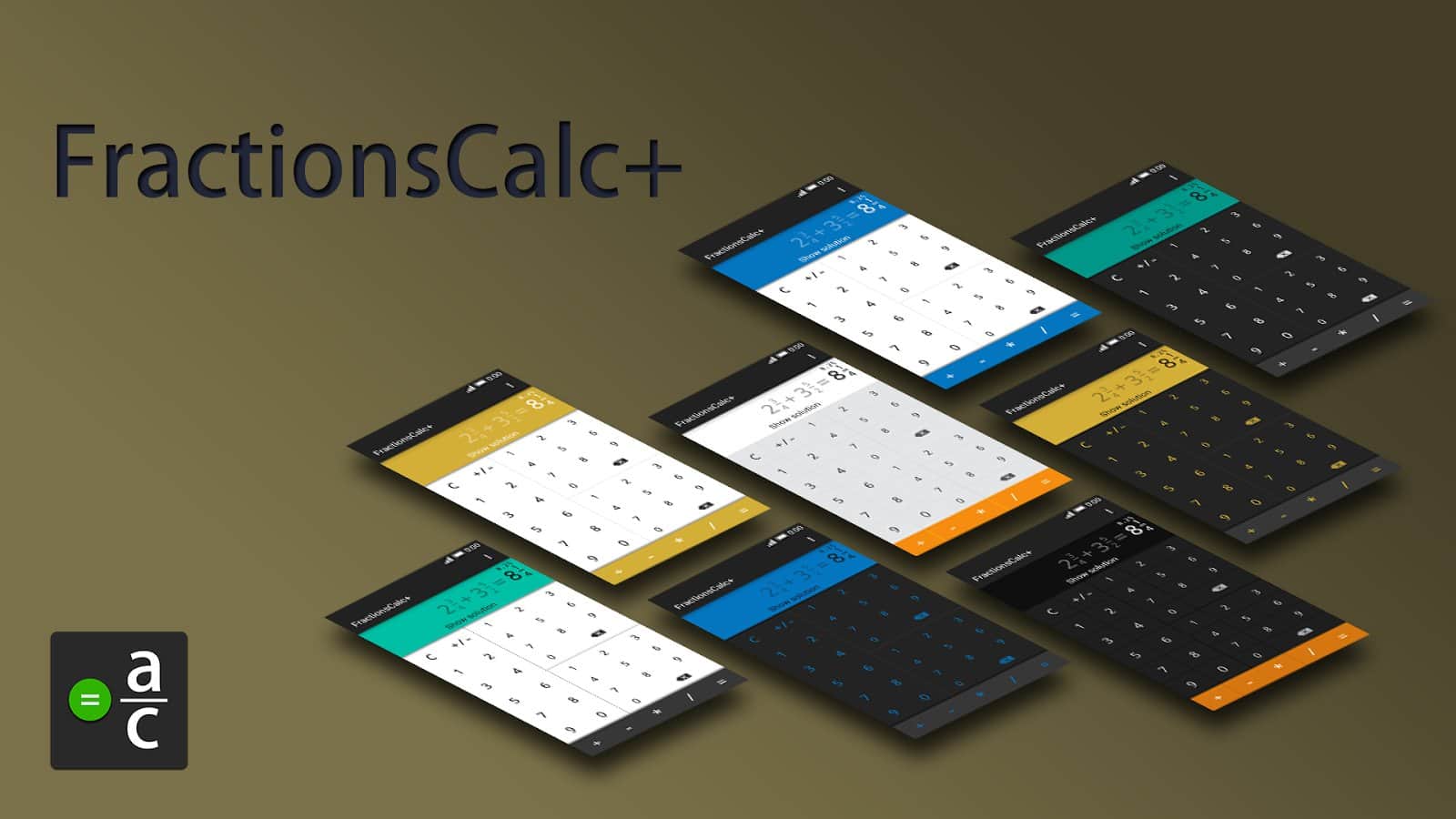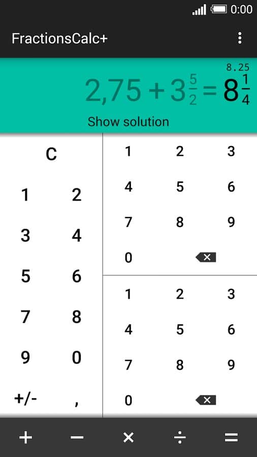 Калькулятор дробей / FractionsCalc+ - красивая и качественная программа для выполнения операций с дробями. Приложение имеет простой и доступный интерфейс, присутствует функция сокращения дроби и дополнительный вывод результата в десятичном формате, а так же вывод подробного хода решения.