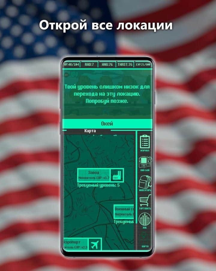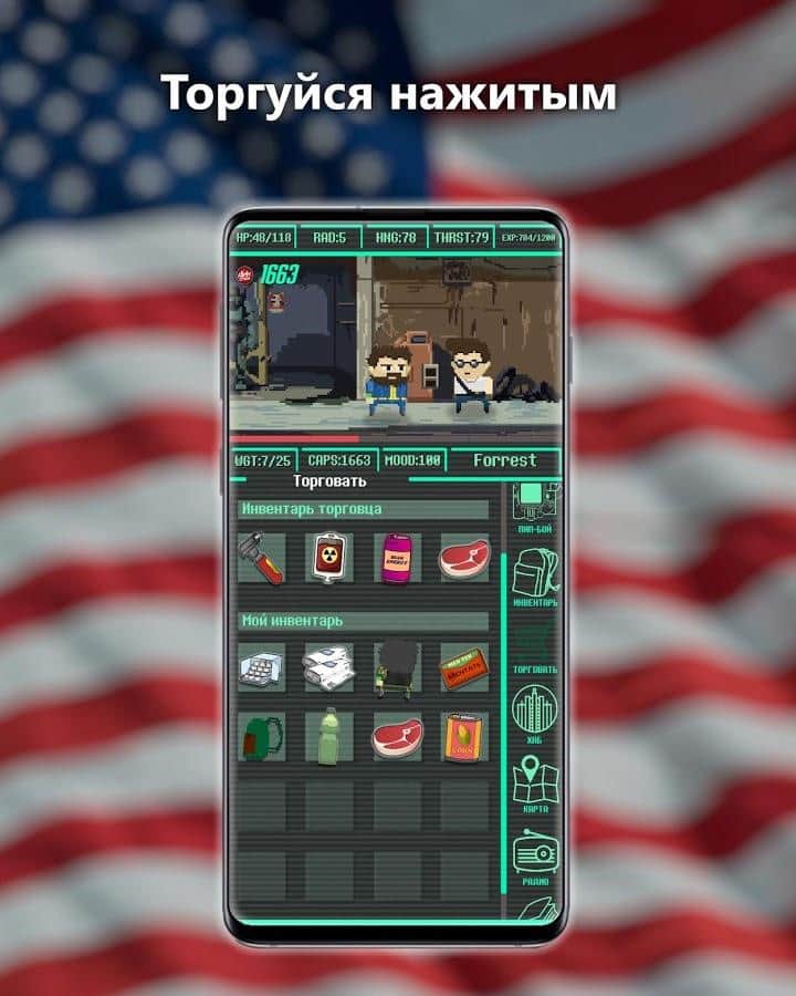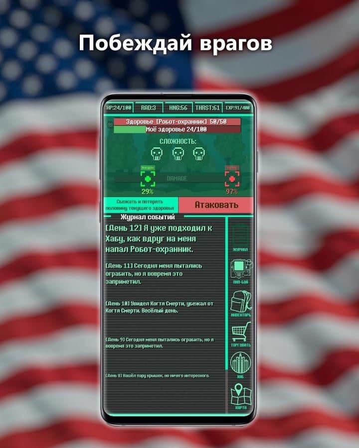 Карманный Фолыч - Pocket Survivor – lite версия классического Фолаута в довольно интересной подаче через Журнал событий. Это все та же атмосферная и увлекательная ролевая игра, что и была ранее, вот только обо всех своих действиях и последствиях этих действий вы узнаете из Журнала событий, а также слушая радио. Отправляйтесь в увлекательное и сложное приключение по бескрайним просторам Пустоши. Исследуйте окружающий мир, выбрав подходящую для вас тактику. Вы можете сражаться за ресурсы с врагами, которые бродят в одиночку, можете нападать на группы врагов. Торгуйте добытыми в бою или просто найденными расходными материалами, чтобы обзавестись мощным оружием, и, конечно же, не забудьте поискать силовую броню. Прокачайте своего героя по максимуму, чтобы он смог как можно дольше продержаться в этом суровом мире.