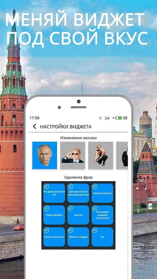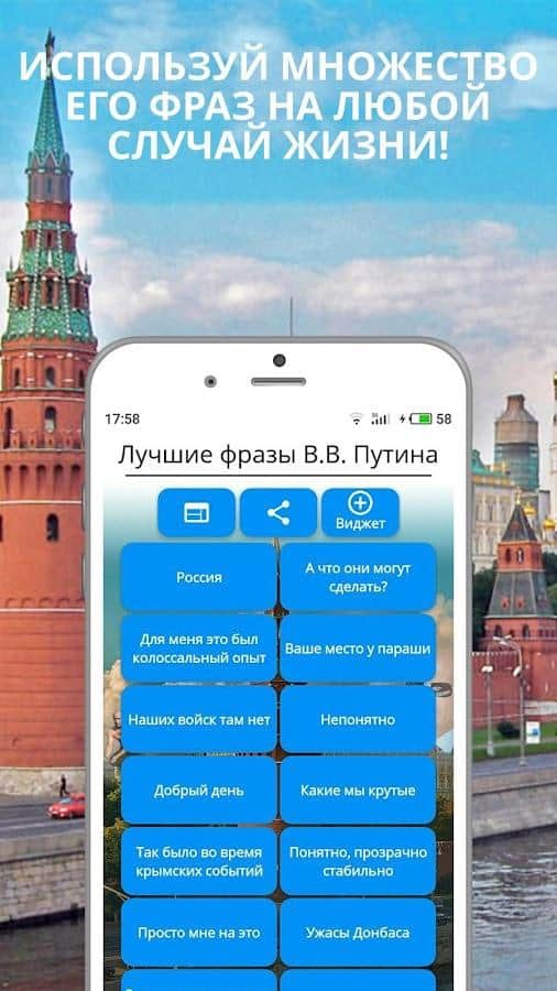 В данном приложении вы отыщите огромное количество фраз верховного главнокомандующего России Владимира Владимировича Путина. Используйте выставленные фразы на хоть какой случай жизни, в особенности если не можете точно подобрать слова. В какой-то момент вы сможете ответить колючей либо пользующейся популярностью фразой Президента, задействуя это приложение. "Российская Федерация", "Мы величавая держава", "Наших войск там нет", "Кхм кхм" и почти все остальные цитаты собраны в одном месте.