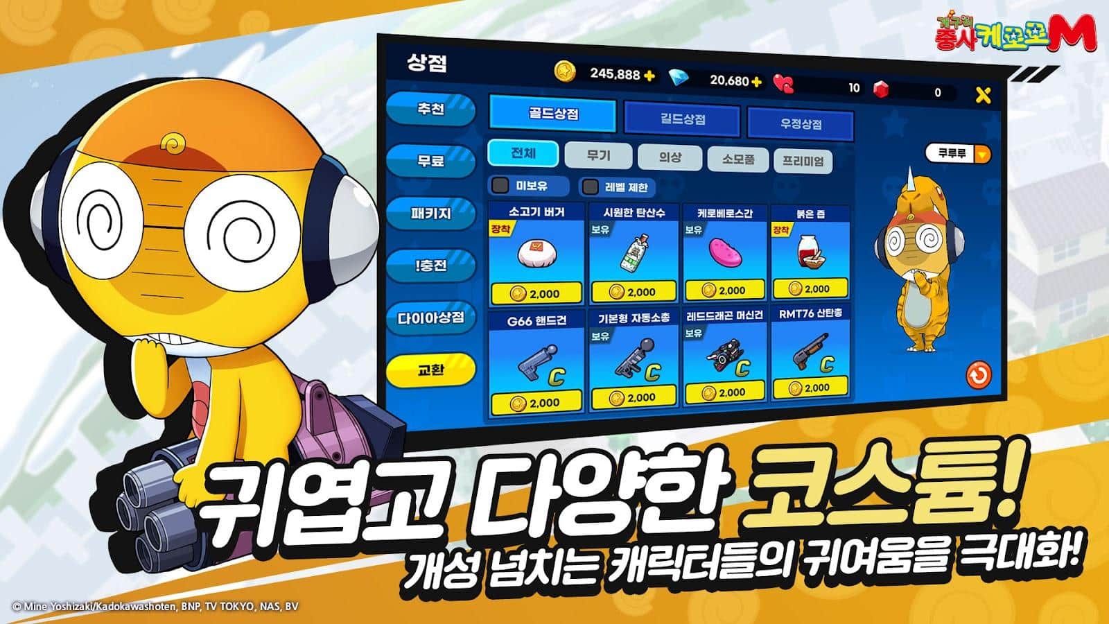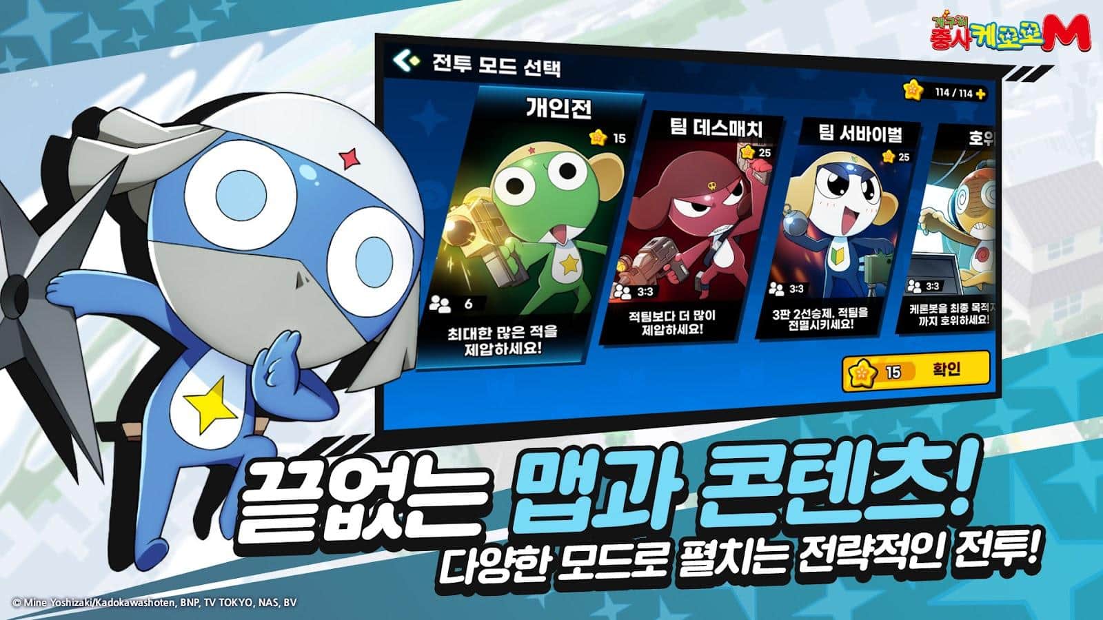 Специально собранный отряд во главе с сержантом Кероро для покорения звезд Керон прямо сейчас готов наступать на других лягушек и выполнить свою миссию, которую они продумывали долгое время! Для победы в сражениях необходимо собрать коллекцию сильного оружия, подобрать удачные комбинации, купить интересные костюмы для главных героев и еду, чтобы оставаться в силе участвовать в дальнейших боях. Изучайте не только новые карты, но и режимы для всех лягушек, в каких вам еще не посчастливилось побывать ранее.