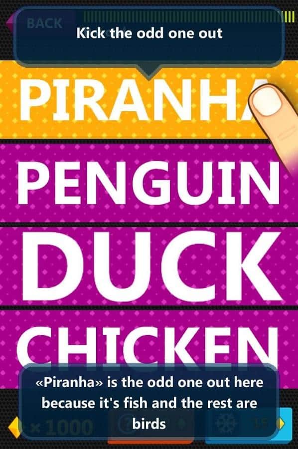 Выкинь лишнее слово - это игра-викторина на андроидб целью которой является — выкинуть лишнее слово из группы. Например, есть 4 слова: «пиранья», «пингвин», «утка», «курица». «Пиранья» это лишнее слово, потому что это рыба, а остальные — птицы. Вам дается 45 секунд. Отгадайте как можно больше слов за это время.