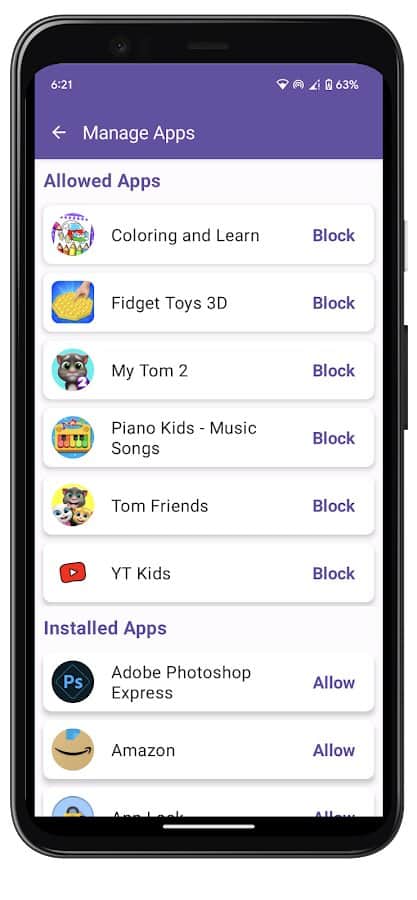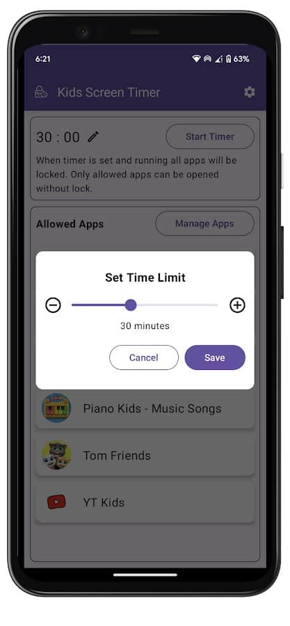 - Контроль доступа: Во время работы таймера ребенок сможет использовать только те приложения, которые вы разрешили. Все остальные приложения будут заблокированы.
