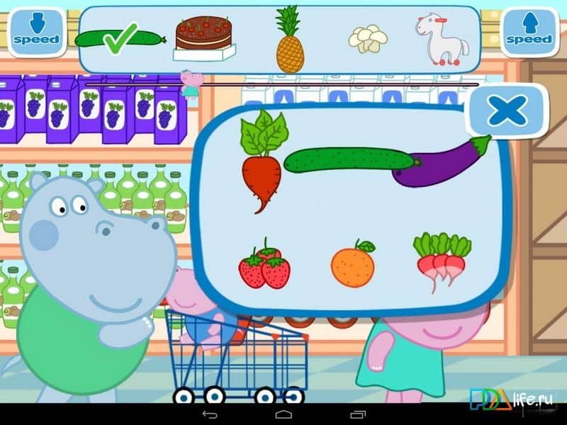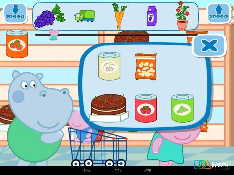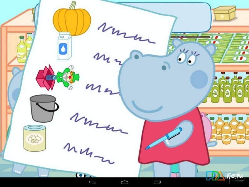 Kids Supermarket - игра для детей, в которой они будут помогать гиппопотаму Пепе, купить нужные продукты в супермаркете. Мама гиппопотам составила список необходимых покупок и отправила папу и детей в магазин за покупками. Вашей задачей будет ходить по магазину, и искать нужные товары из списка, который находиться в верхней части экрана. Как только вы нашли нужный товар, нажимайте на него и кладите его в корзину. Наблюдайте за папой гиппопотамом и братиком которые так и норовят положить в корзину товары не указанные в списке. Как только покупки закончатся, вы поедите домой, где мама проверит все товары и сравнит их со списком, за отлично проделанную работу вы получите награду.