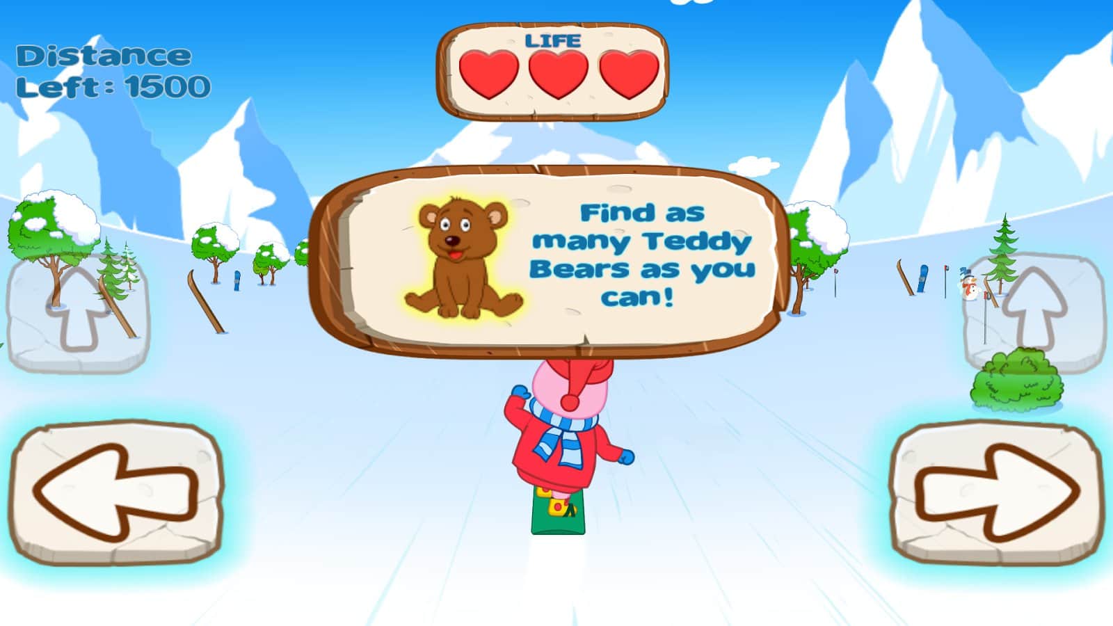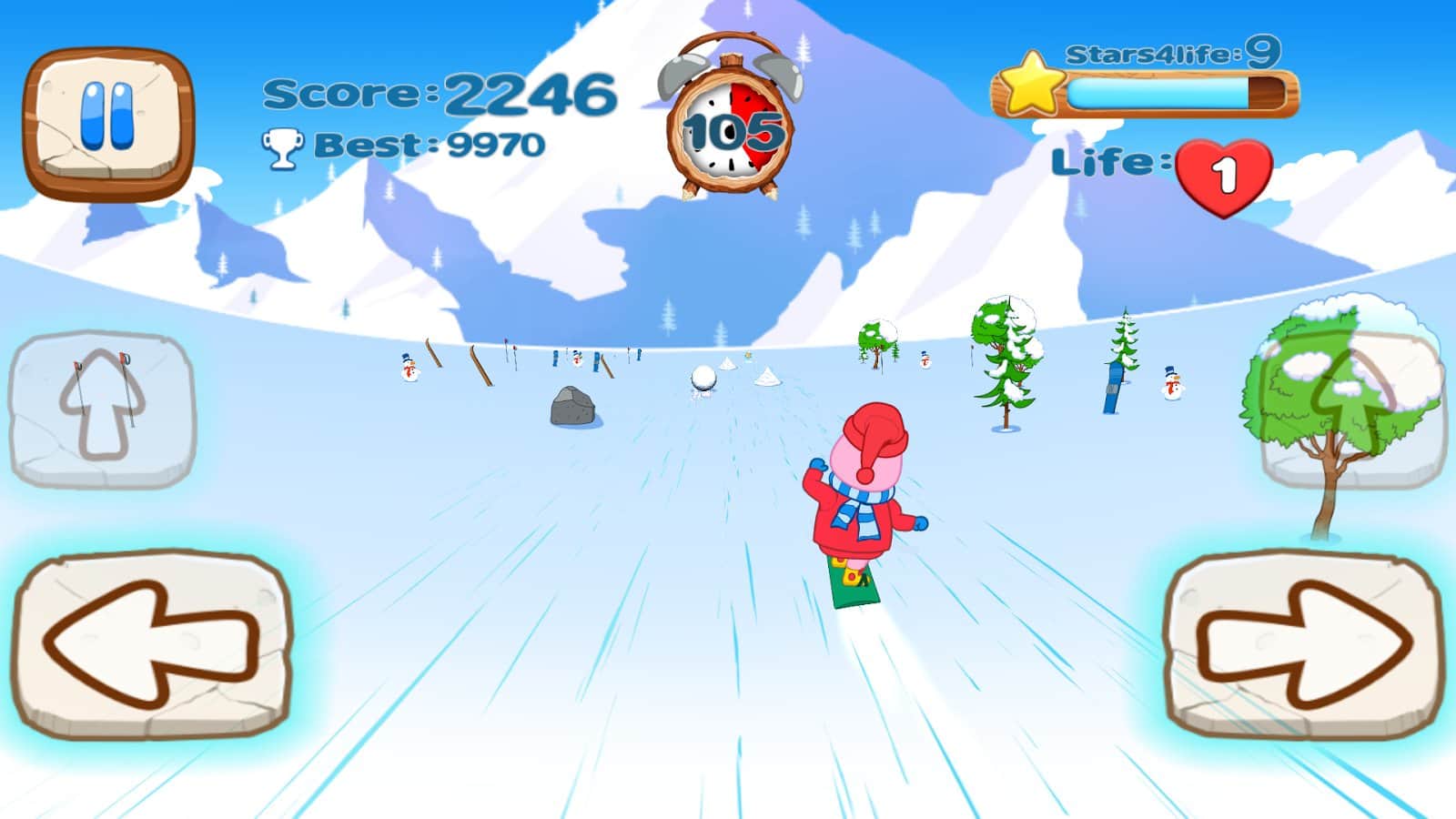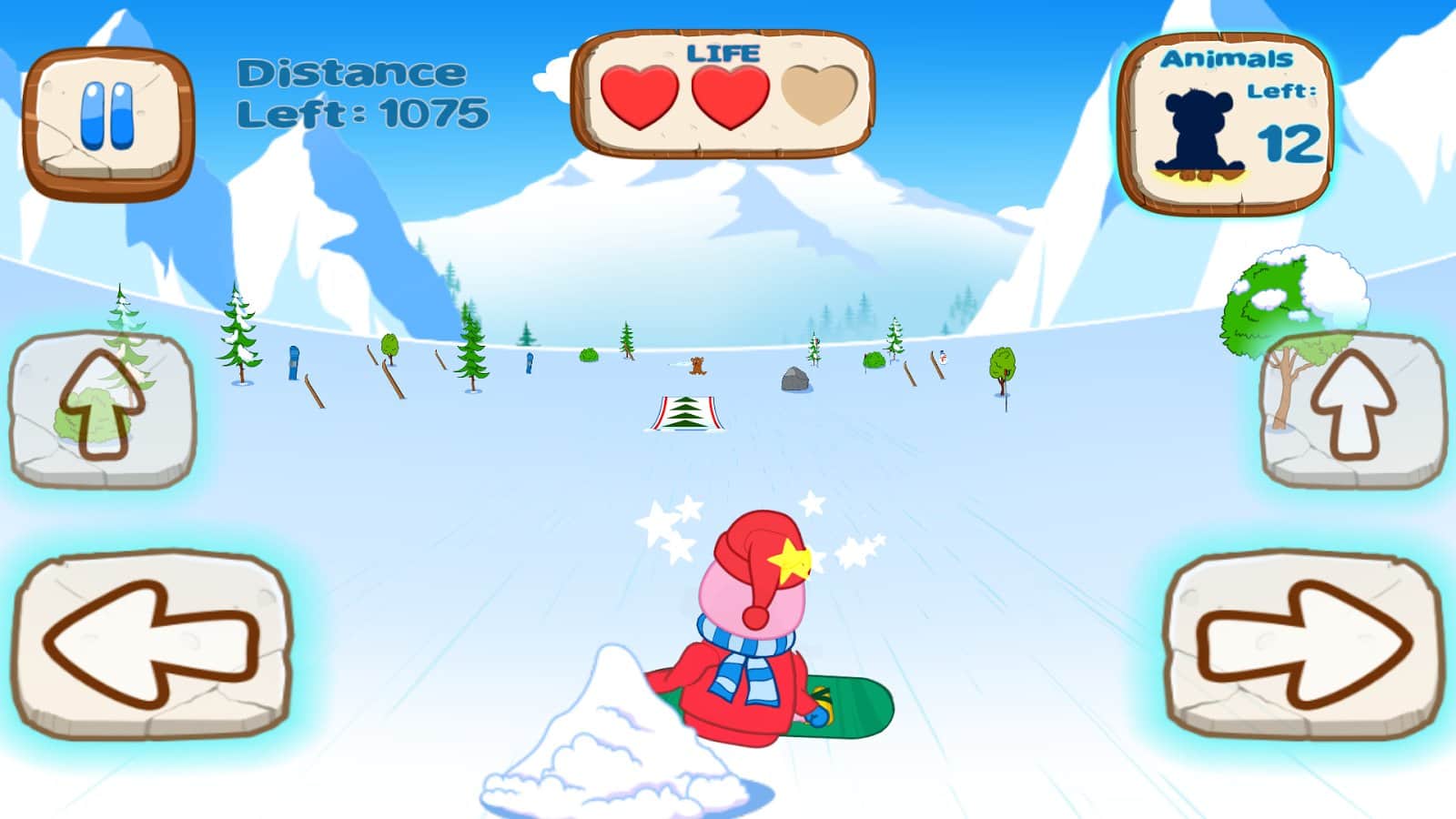 Первый режим аркадный, где вам предстоит проехать 20 уровней на сноуборде при этом, собирая животных которые потерялись. Каждый уровень порадует вас разнообразными препятствиями и трамплинами. Всего вам будет даваться три жизни, не допускайте падений и продержитесь до конца игры.