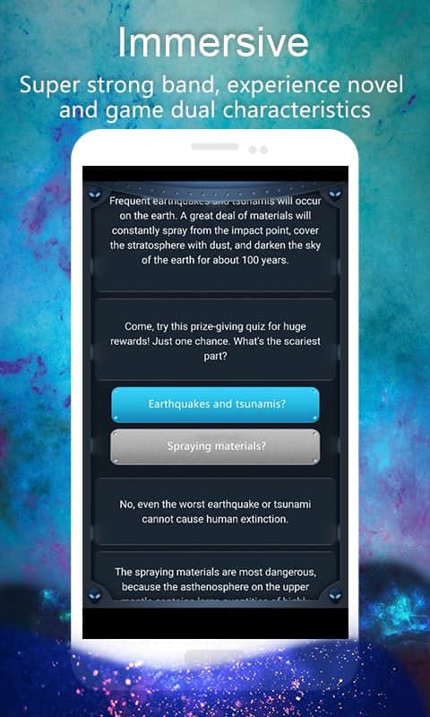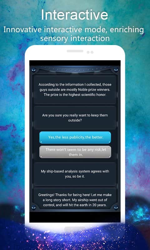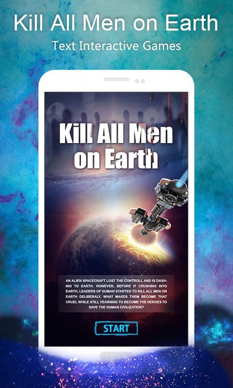 Kill All Men on Earth: Text Interactive Games – интерактивная игра на андроид, где вы будете решать судьбу всего человечества. В этой игре наступил день апокалипсиса и теперь судьба всего человечества находиться в ваших руках и вам решать, кто умрет, а кто останется дальше жить. Нашу планету атаковали пришельцы и вынесли вердикт что наша планете находится на грани исчезновения. Все что от вас теперь требуется это сделать правильный выбор помочь людям выжить или обречь их на смерть. Отвечайте на поставленные вопросы и с каждым ответом вы будете делать выбор, решая судьбу мира. Игра порадует вас более 40 часами игры и 30 различными концовками, которые будут напрямую зависеть от ваших решений. В этой игре вы сможете путешествовать во времени и возвращаться назад для того чтобы изменить ход событий.