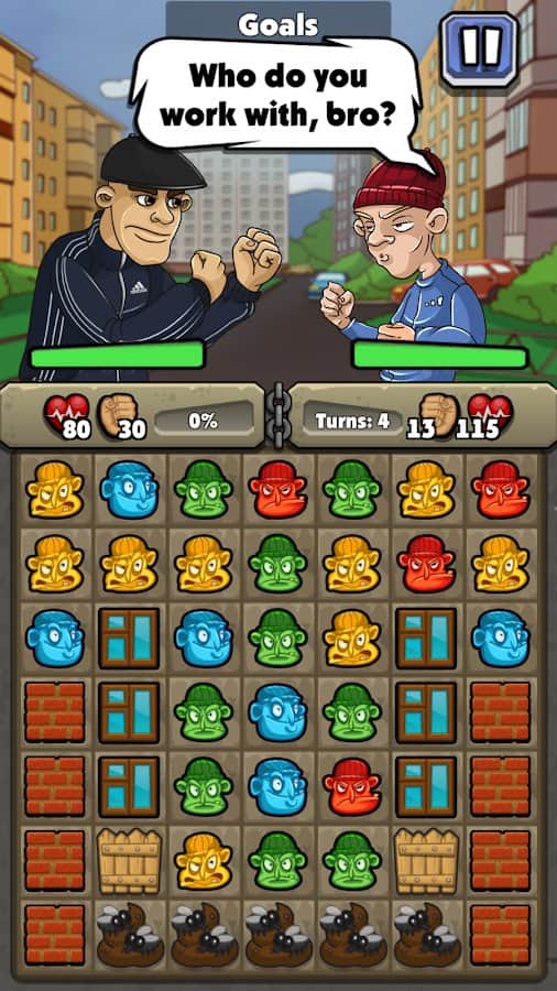 Kingpin. Free match 3 – новая игра на андроид, с четким геймплеем. В этой игре вы окунетесь в мир субкультуры гопников, бандитов и тюрьмы. В этой игре из жанра три в ряд вашей задачей будет управлять гопниками и вступать в бой с противниками. Составляйте ряды из трех и более объектов и накапливайте силу для нанесения удара. Отправьте своего соперника в нокаут с одного удара и получайте очки. Выполняйте многочисленные и разнообразные квесты предложенные игрой и захватывайте один за другим районы города и станьте воротилой Братеевска. Бросайте вызов реальным игрокам со всего мира и добивайтесь отличных результатов. Составляйте длинные цепочки из объектов и получайте награды.