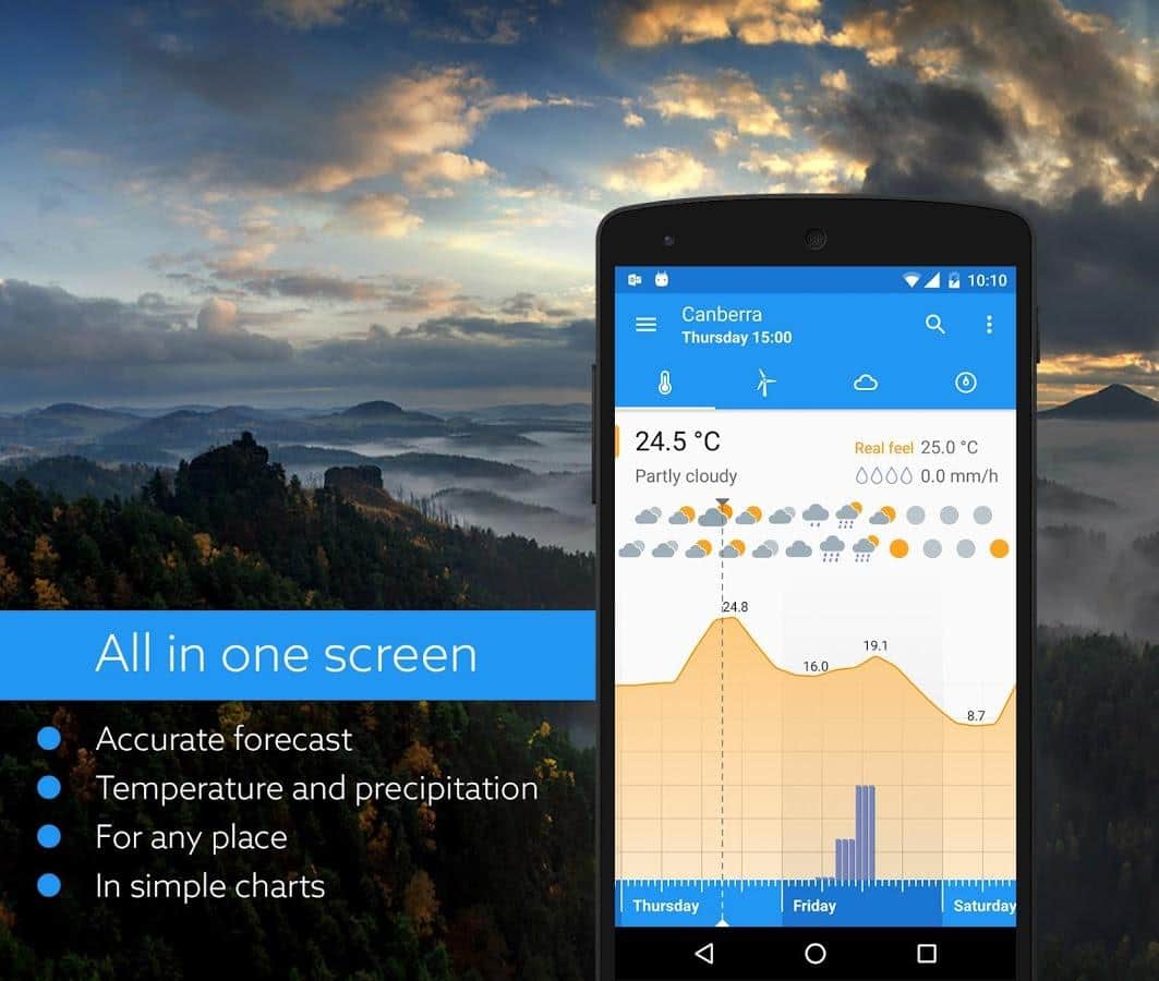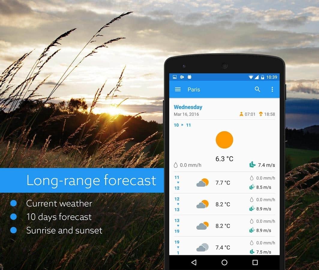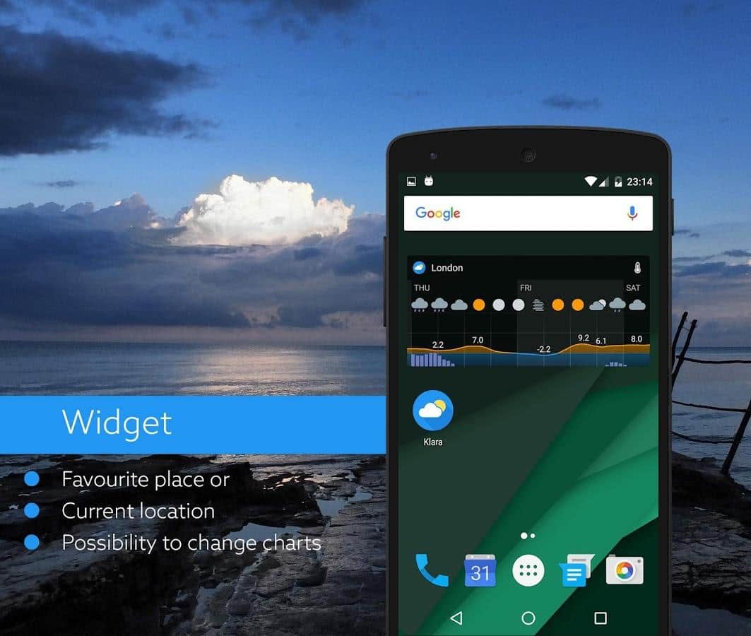 Klara - Очень точный, и качественный прогноз погоды. Главное отличие этого приложение от ему подобных в том, что здесь весьма необычное управление. Да, именно управление, как бы странно это не звучало. Вам предстоит в ручную передвигать ползунок, тем самым меняя время, а соответственно и погоду на определенный участок времени. Приложение весьма забавное, красочное и имеет удобный интерфейс. В добавок к этому, прогноз строится не только из температуры и наличия дождя, а так же покажет наличие облачности, и давление. Будьте всегда в курсе прогноза погоды.