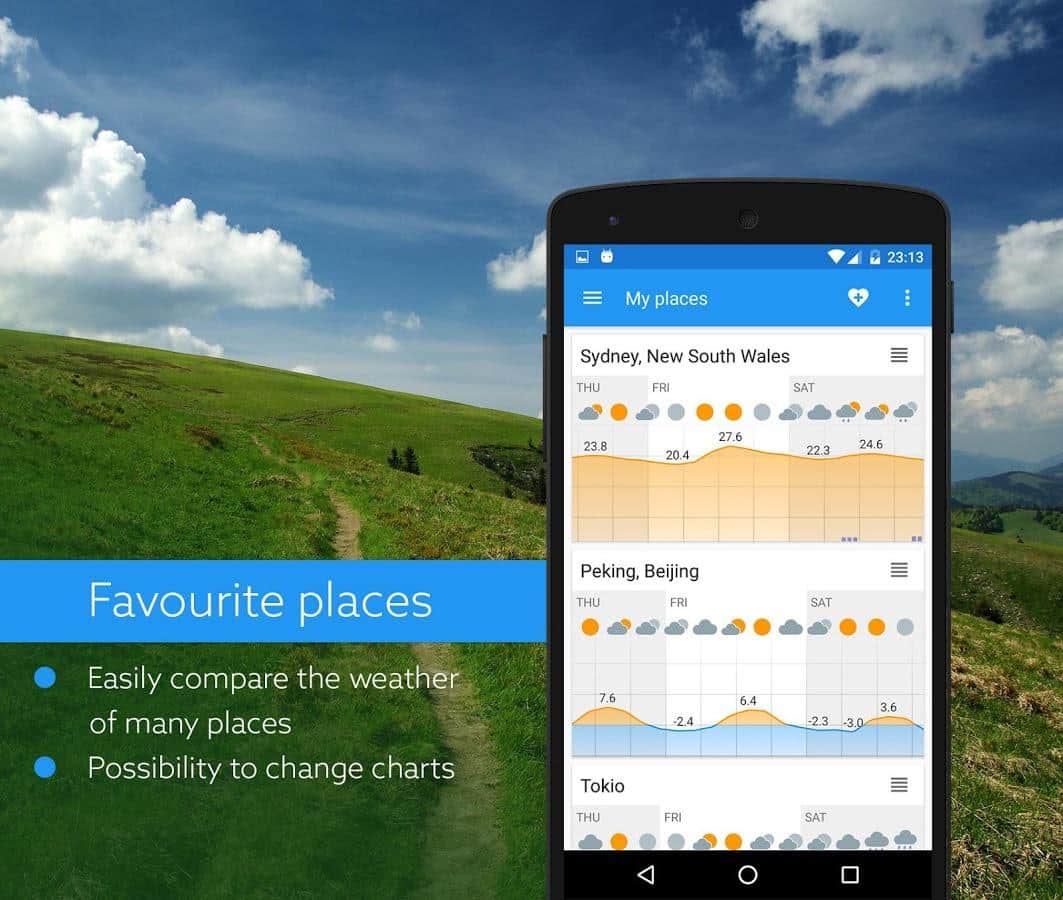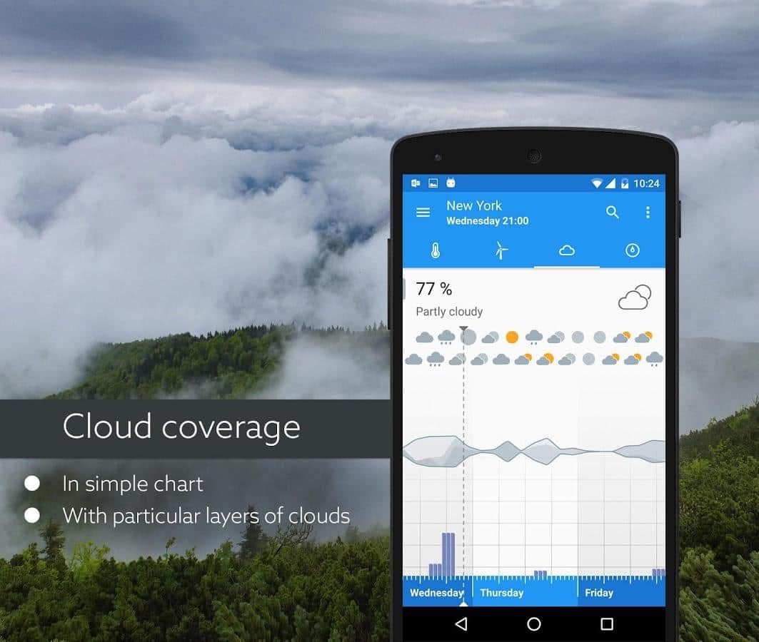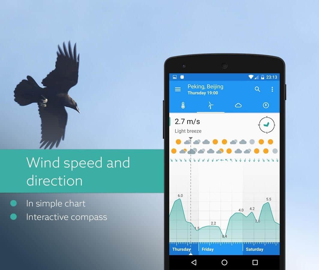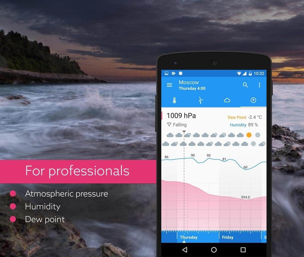 Klara - Очень точный, и качественный прогноз погоды. Главное отличие этого приложение от ему подобных в том, что здесь весьма необычное управление. Да, именно управление, как бы странно это не звучало. Вам предстоит в ручную передвигать ползунок, тем самым меняя время, а соответственно и погоду на определенный участок времени. Приложение весьма забавное, красочное и имеет удобный интерфейс. В добавок к этому, прогноз строится не только из температуры и наличия дождя, а так же покажет наличие облачности, и давление. Будьте всегда в курсе прогноза погоды.