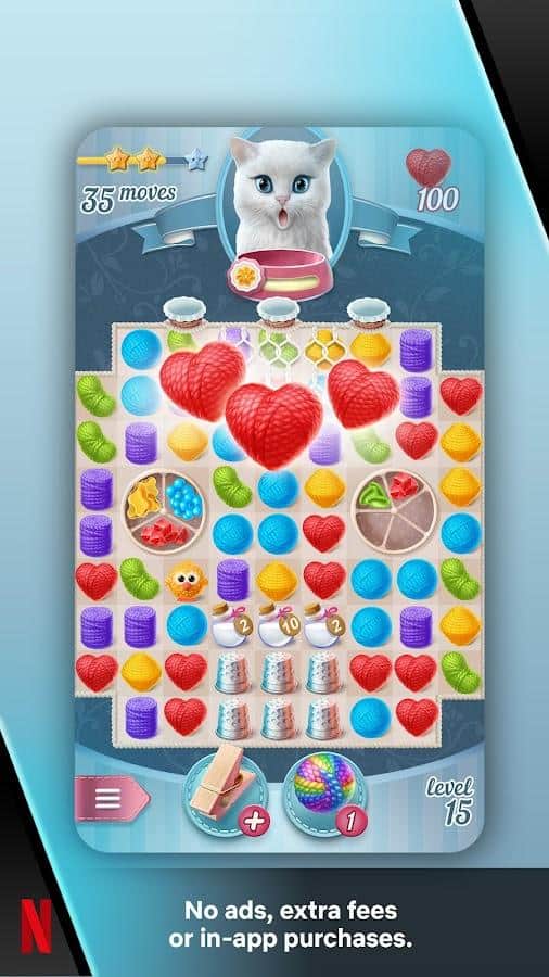 Knittens - Привет, друзья! У меня есть классная новость для тех, кто любит кошек и игры. Вы знаете, что есть такая платформа, которая называется Netflix, и там можно играть в очень интересные игры. А сегодня я расскажу вам про одну из них! Это игра про кошек, которым очень нужна ваша помощь. Они очень хотят выглядеть красиво и модно, но им нужна ваша помощь, чтобы нарядиться. Чтобы им помочь, мы будем играть в игру, которая называется "Три в ряд". Это очень веселая игра, где нам нужно решать задачки и получать мотки пряжи.