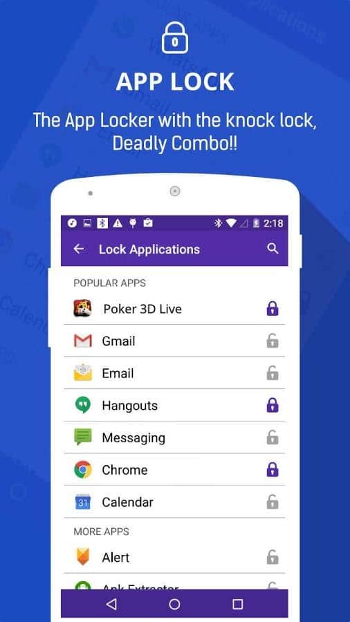Knock Lock - AppLock Screen - Новое слово в технологии блокировки экрана. Это приложение кардинально изменит ваш взгляд на блокировщики экрана. Одним из самых важных параметров о котором сразу стоит сказать является то, что оно срабатывает даже при механической блокировке экрана! Другие приложение работают только если вы их запустите и с их помощью заблокируете экран, здесь же, вы можете блокировать его кнопкой на вашем устройстве, оно все равно будет работать! Работает оно по одному простому принципу, вам на экране покажут большие буквы, и вы введете код, а когда захотите снять блокировку, вам нужно будет наугад, нажать на те места где были расположены буквы, таким образом блокировка снимется, а если это будет кто то другой, то он вряд ли догадается тыкать в обои на вашем экране.