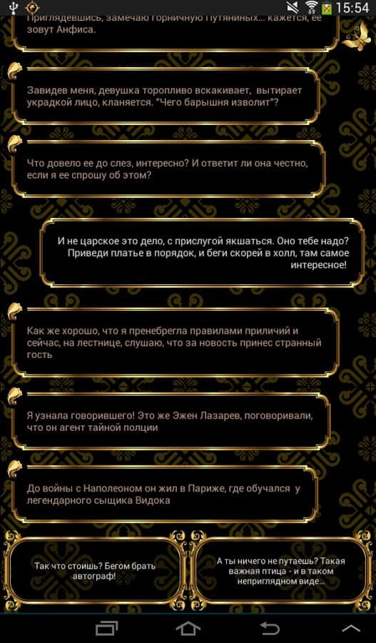 Княжна - Погрузитесь в удивительную и захватывающую историю начала ХIX века. В игре рассказывается про историю о проклятье юной княжны Анастасии Разумовской. Вам предстоит вместе с главной героиней путешествовать по многочисленным сюжетным линиям. Вам стоит предельно аккуратно давать советы и рекомендации Анастасии, ведь от этого зависит её жизнь. Именно от вас зависит, блистать Княжне на балу или скрываться от разбойников, разоблачить аферистов или сгинуть в борделе. Одна из самых важных отличий этой игры от других, так это то, что в игре присутствует огромное количество небольших сюжетных линий. Даже сами авторы не могут назвать точной цифры.