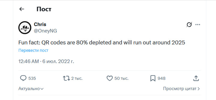 Еще в 2022 году пользователь X/Twitter заявил, что ресурс QR-кодов исчерпан на 80% и уже 2025 году они закончатся. Как нам отлично видно из 2026, предсказание не сбылось. Сложно сказать, откуда вообще взялся такой странный тезис, но кто бы его первым не озвучил, с математикой он явно был не в лучших отношениях.