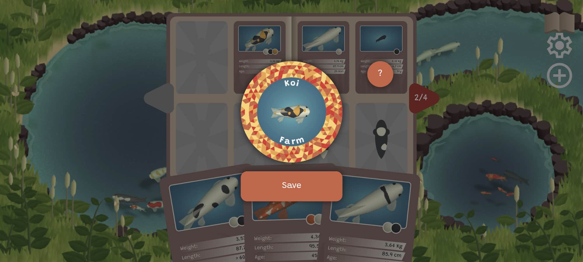 Koi Farm - это мир бесконечных возможностей для создания и коллекционирования потрясающих кои. Исследуй бесконечное разнообразие узоров и цветов, скрещивай своих рыбок и открывай новые, удивительные мутации. Скрещивай кои с интересными узорами и цветами, чтобы получить уникальных рыбок с неповторимым шармом. Храни лучших кои в своей коллекции, как настоящие произведения искусства. Открой для себя новые неизведанные мутации и расширь свой мир кои. Делись своими уникальными кои с другими игроками и создавай вместе новые шедевры.