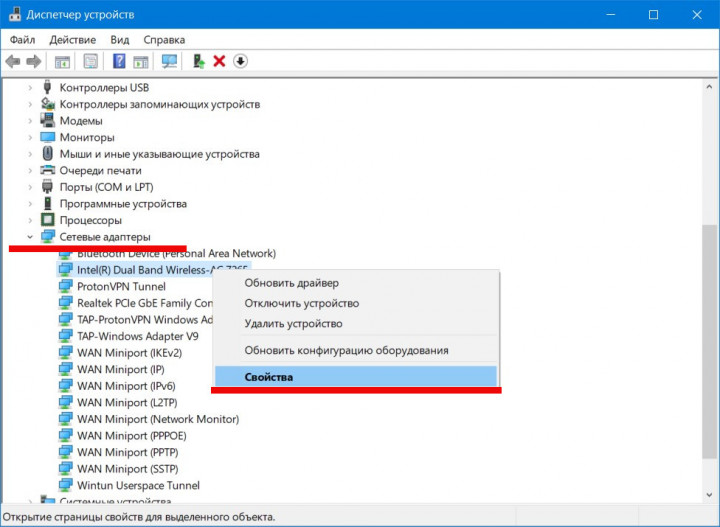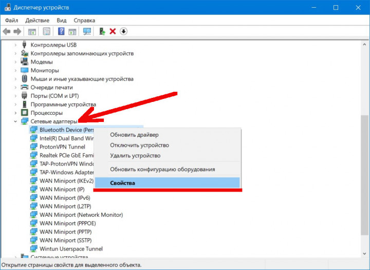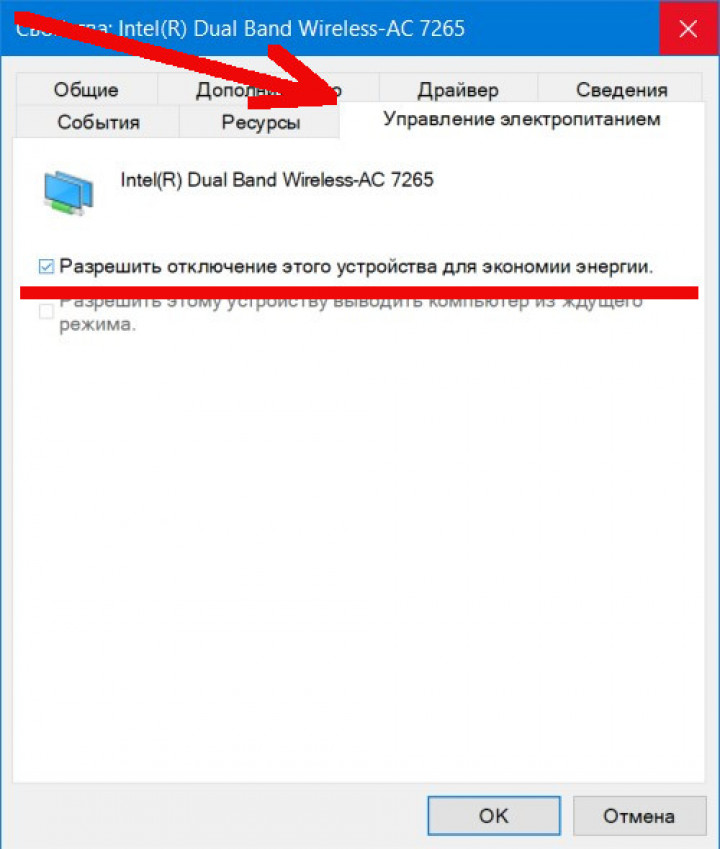 Уделите внимание режиму экономии энергии: беспроводные модули могут отключаться при его активации. Чтобы они оставались активными всегда, перейдите в Диспетчер устройств (вызывается из контекстного меню на кнопке Пуск), выберите нужный адаптер, вызовите на нем Контекстное меню — Свойства, в открывшемся окне найдите вкладку “Управление электропитанием” и снимите галочку напротив пункта “Разрешить отключение этого устройства для экономии энергии”.