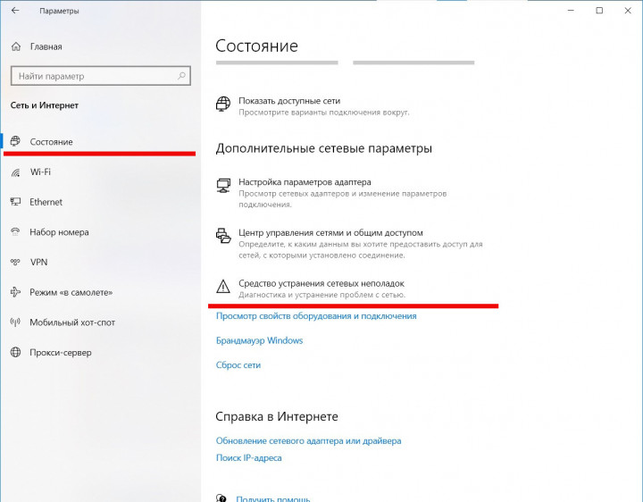 Не стоит недооценивать штатные средства Windows. Интересующий нас инструмент называется Windows Network Troubleshooter и его нужно искать по пути Пуск — Параметры — Сеть и Интернет — Состояние — Средство устранения сетевых неполадок. Если повезет, система самостоятельно обнаружит и решит проблему. Если нет — пора переходить к более продвинутым методам.