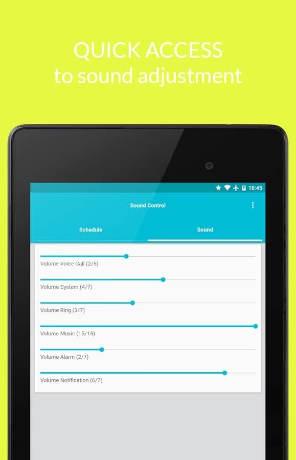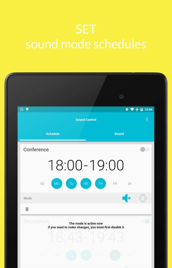 Часто бывает так, что мы выставляем определенный режим на своем смартфоне или или планшете регулярно в определенное время. И каждый раз вынуждены возиться с набором одинаковых настроек. Или, что еще чаще, включив, к примеру, беззвучный режим, забываем его выключить и пропускаем важные звонки. Чтобы избежать подобных конфузов и просто не тратить уйму времени на однотипные действия можно воспользоваться представленным приложением. Оно позволяет гибко и предельно подробно настроить все параметры звука на устройстве, время включения и отключения настроек и таким образом экономит владельцу массу времени. Интерфейс приложения выглядит просто и, благодаря Material Design, современно.