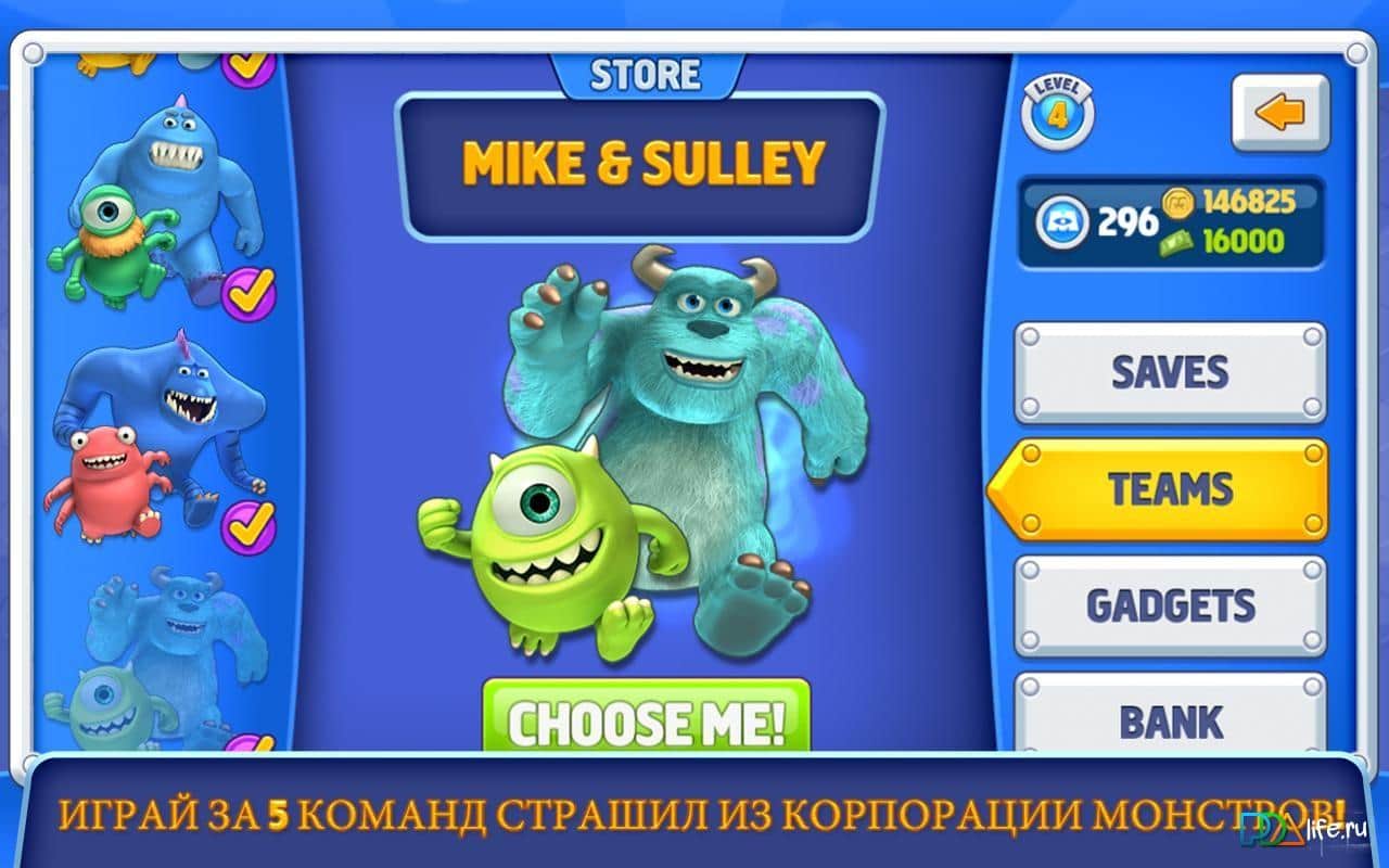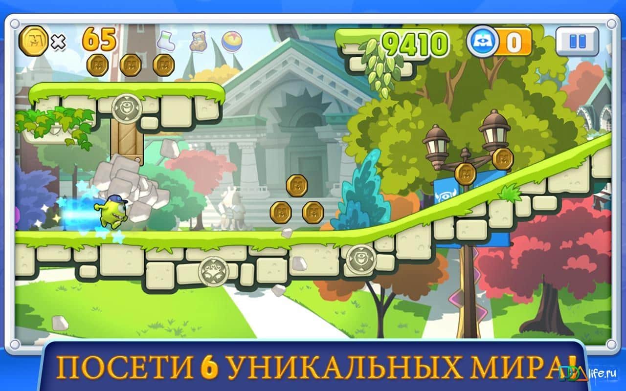 Корпорация монстров. Побег - Одноименный андроид раннер по мотивам мультфильма от Pixar и Disney. Вам предстоит бегать и прыгать в этой увлекательной игре. Перенесись в мир Монстрополиса вместе со знаменитыми героями мультфильма, найди способ помочь Майку и Салли спасти малышку Бу. Вас ждет игра за шесть команд и шесть уникальных миров для прохождения.