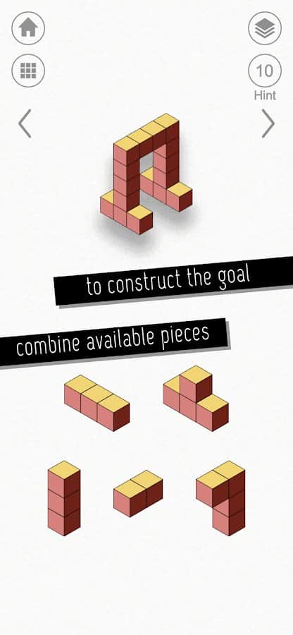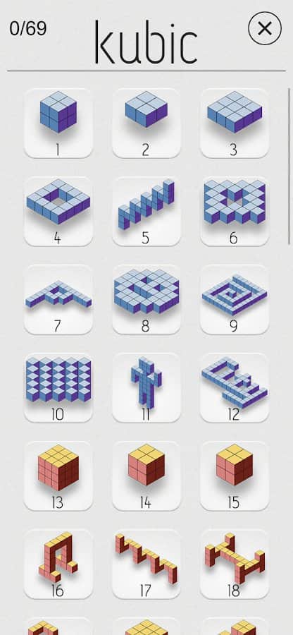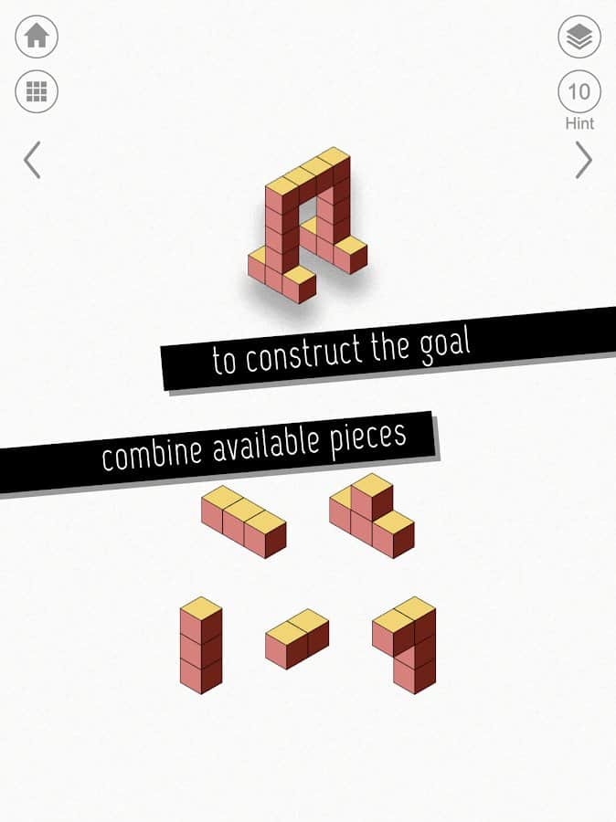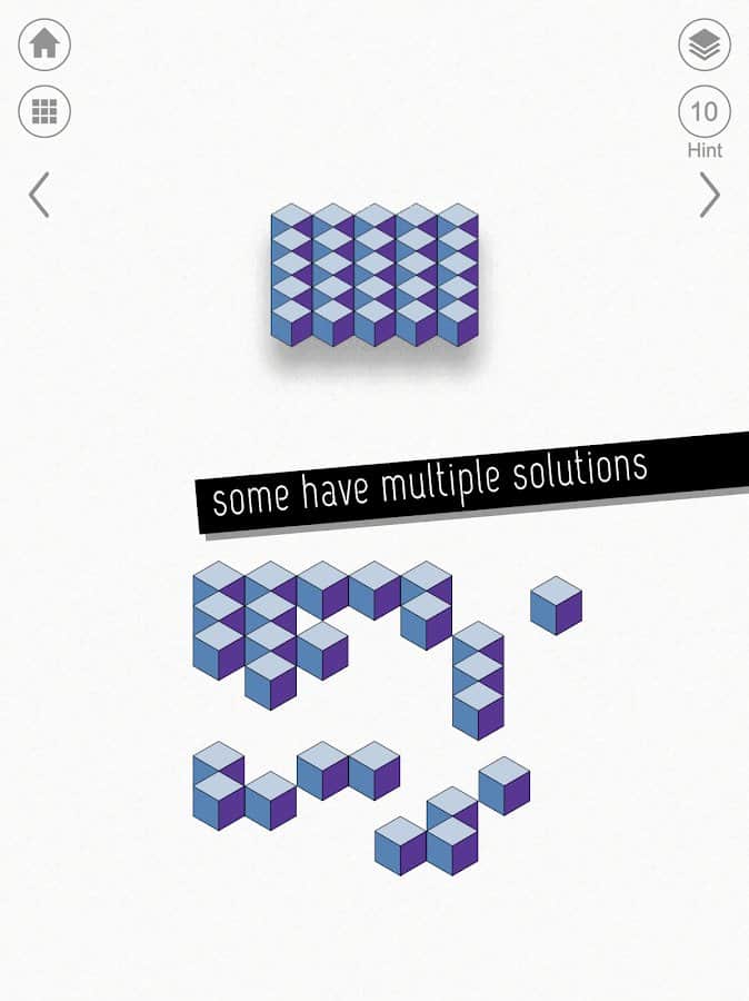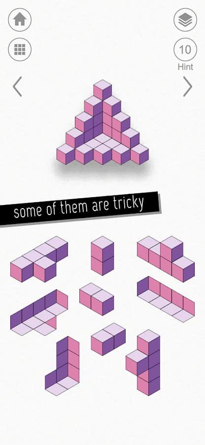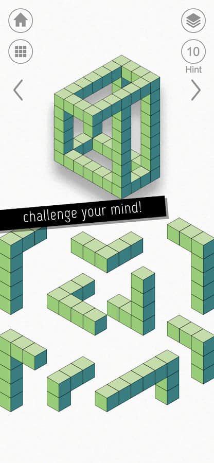kubic - Чтобы расслабиться, и в то же время напрячь мозг, нужно хорошенько постараться. Успокаивающая музыка и минималистичная графика необычных головоломок может развить такие возможности. Более 60 уровней разработаны для поиска и складывания деталей по готовой картинке. Трудность состоит в том, что будут лишние детали. Также, они не будут соединяться, а только накладываться друг на друга. Такая фишка сделана для лучшего результата, ибо можно автоматически попробовать сложить все предметы вместе и пройти уровень.