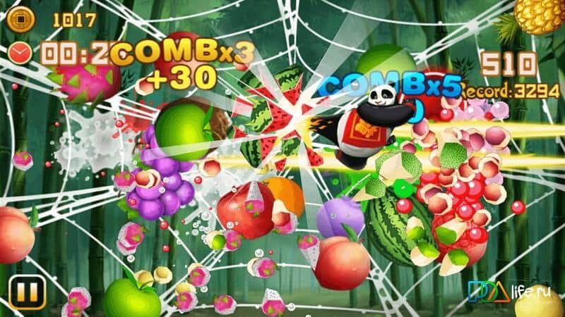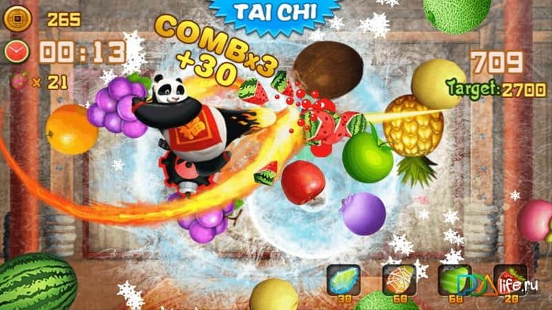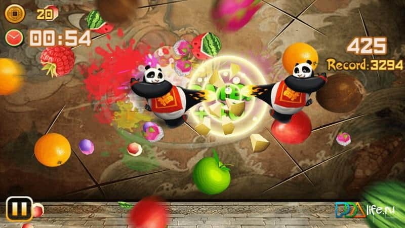 Kung Fu Fruit - сочная аркада на андроид, где вам с помощью силы Кунфу-Панды предстоит отбивать натиск фруктов. Управляйте пандой и разбивайте фрукты на мелкие кусочки благодаря комбо ударам и дополнительным бонусам, которые позволят замедлить натиск, призвать на помощь дракона или помогут вашему герою раздвоиться. Покажите в действии непобедимую силу главного героя и не пропустите не один фрукт, летящий в вас на протяжении 60 захватывающих уровней. С каждым новым уровнем сложность игры будет увеличиваться, а количество фруктов возрастать в геометрической прогрессии.