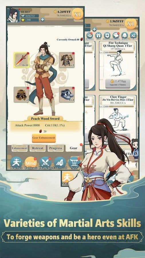Kung fu Supreme - Тут вы сможете практиковаться, продвигаться и преодолевать все виды мистических боевых искусств, почувствовать очарование ментальных техник, техник кулака, ноги, клинка и ножика, понять глубочайшее восточное кунг-фу и практиковаться с мастерами со всех частей света. Участвуйте в турнирах по боевым искусствам и делайте практики для объединения страны, заполучайте драгоценные сокровища, побеждайте сильнейших противников, повышайте свой уровень и мастерские способности. Каждый день улучшайте свою боевую мощь, чтобы стать непобедимым в мире кунг-фу.