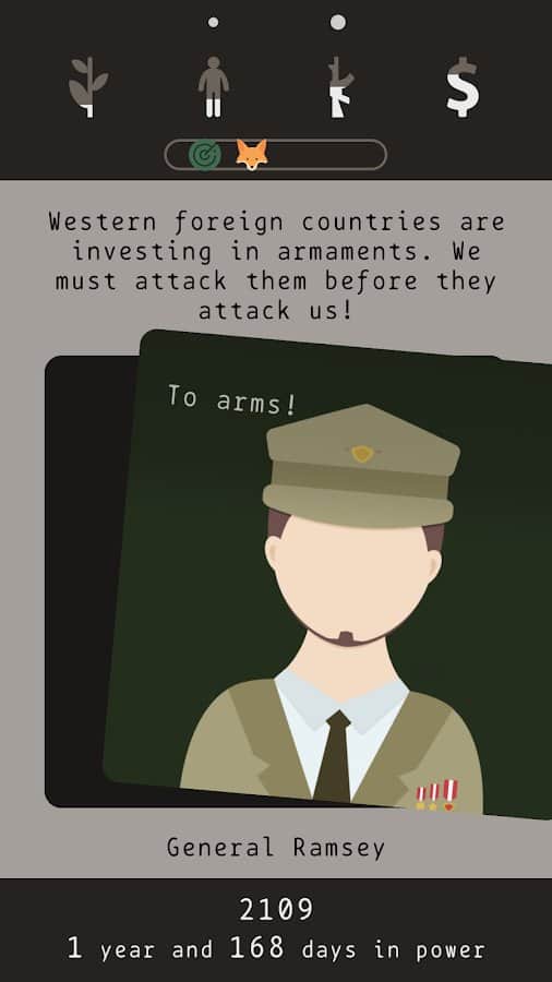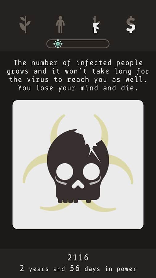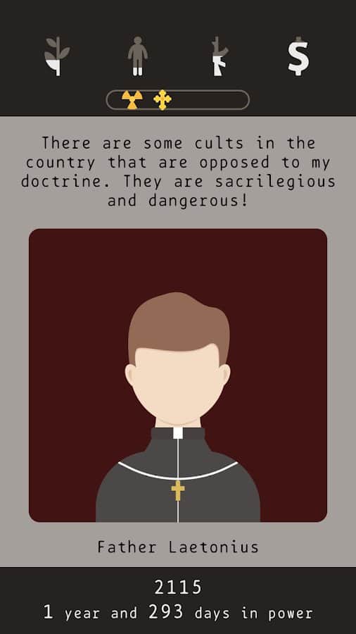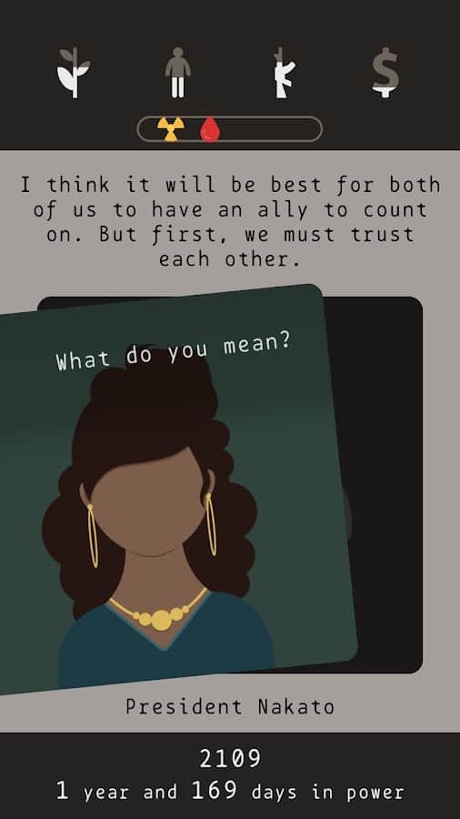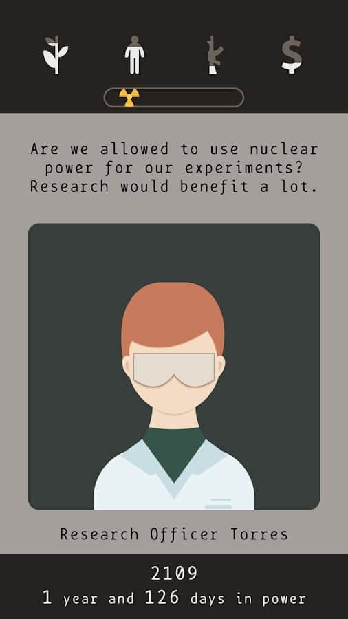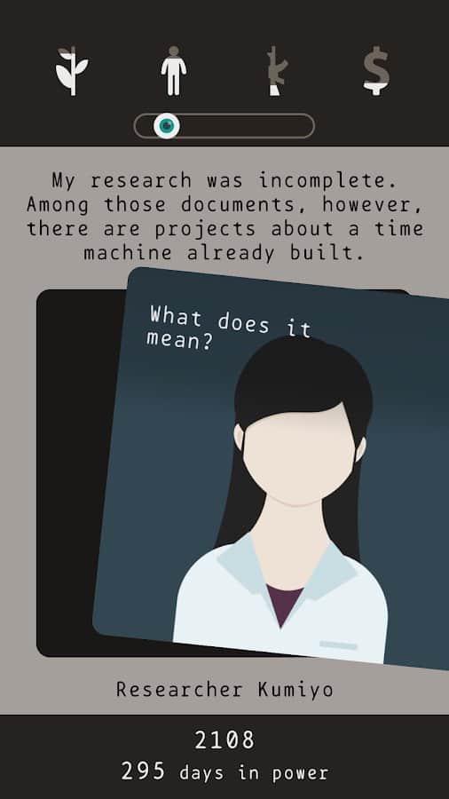 Сюжет. Вы президент страны которая пережила ядерную войну. Теперь ваша задача выжить. Вы не человек, а хрен пойми кто. Вас послало само время для чего-то, а для чего сами узнаете. В игре есть три концовки и чтобы выйти на хорошую вам должно повезти и вы должны будете принять важное решение. В противном случае смерть или стазис.