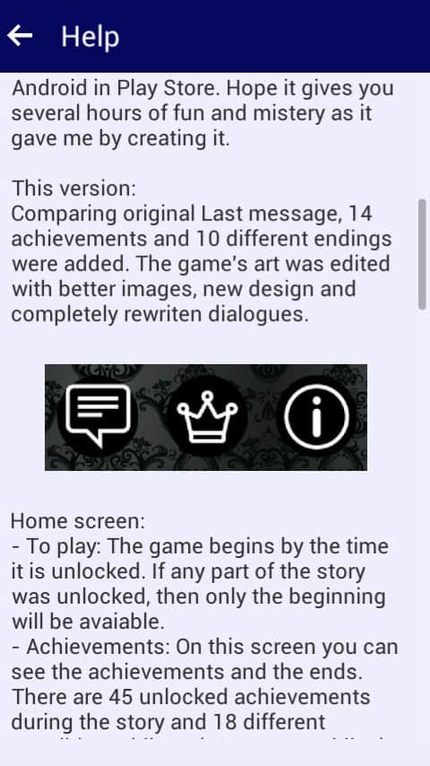 Last Message Plus – пугающая игра на андроид, где вы будете вести переписку с незнакомым вам человеком, попавшим в беду. Вам на телефон будет приходить сообщения с незнакомого номера, и этот человек будет просить вас о помощи. Вашей задачей будет выбирать из различных вариантов ответа правильный, и помочь человеку выбраться из непростой ситуации. Ведите героя по лабиринту и темным туннелям, где могут повстречаться существа, при виде которых в жилах стынет кровь. Делайте правильный выбор и разблокируйте 45 достижений. В игре вы найдете 18 различных вариантов концовок.