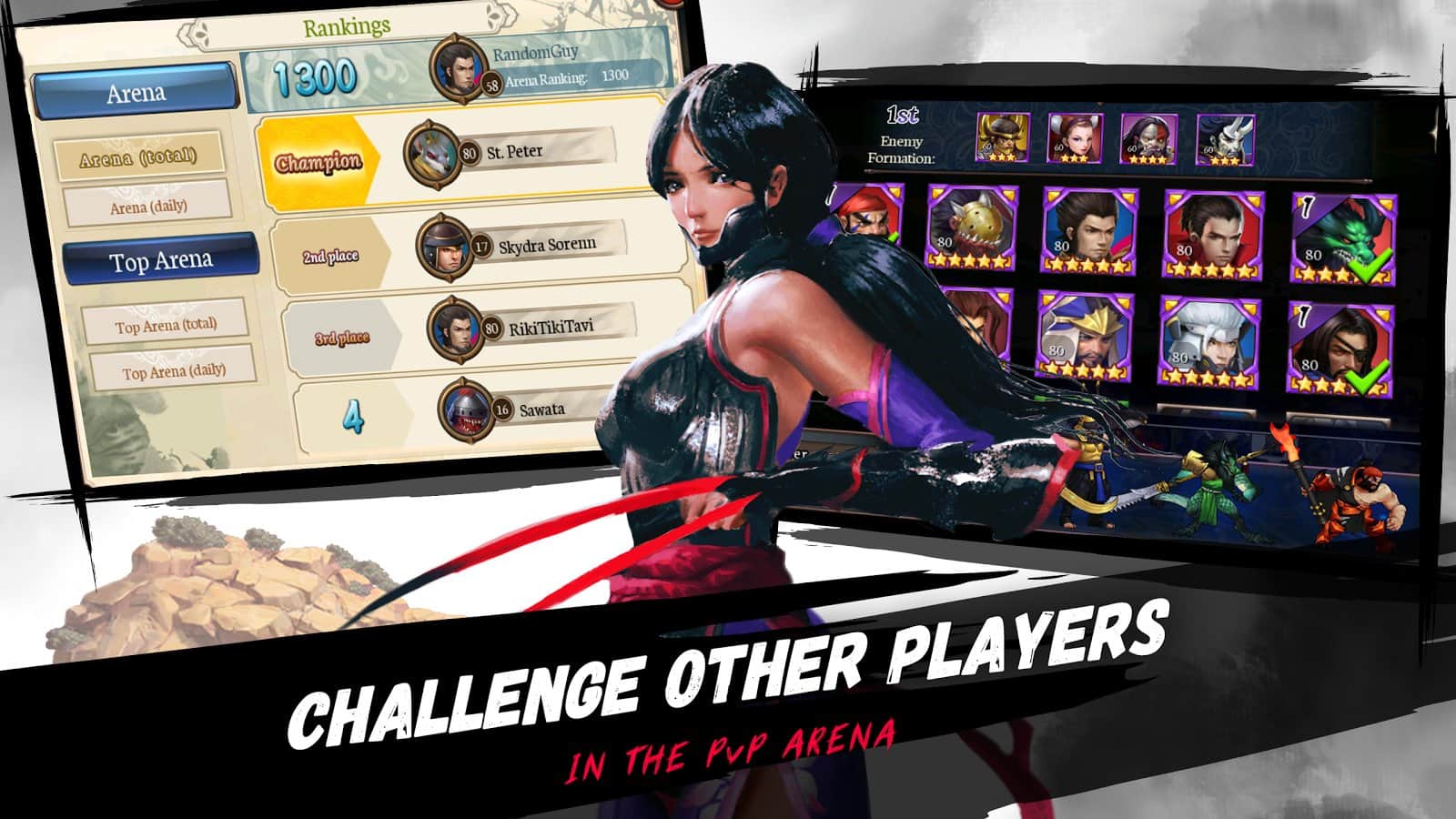 Legends of 100 Heroes - 100 легендарных воинов, готовы сражаться с любыми воинами и доблестно принять удар на себя. Сюжетная линия приготовила для вас мир, полный красок и опасных приключений. Сражения захватывают с первого удара мечом и возможность играть как против НПС, так и против реальных людей делает эту стратегическую, ролевую игру ещё интересней. В игре в ы будет в поиске своего собственного стиля. Соберите свою команду и правильно распределяйте их силы на поле боя – от ваших тактических умений зависит исход битвы. Покажите все на что вы способны в PvP режиме.