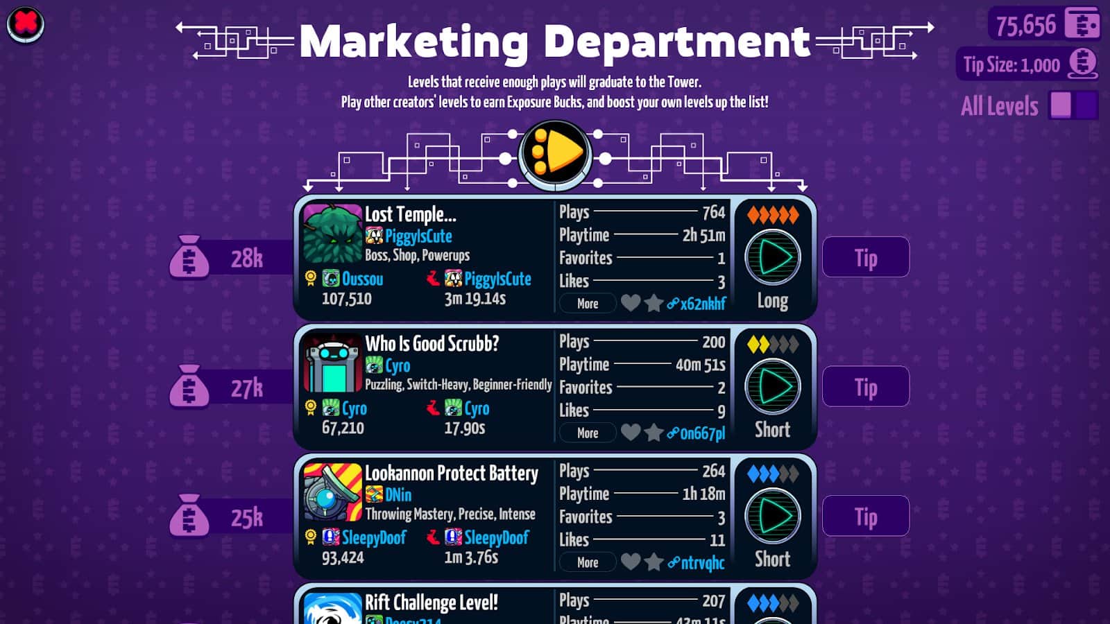 Как новый сотрудник отдела Levelhead вы несете ответственность за подготовку вашего робота-доставщика GR-18 к любой ситуации. Создавайте свои уровни в интуитивно понятном редакторе в мастерской, а затем представляйте их всему миру. Стройте невероятные устройства и штуковины, создавайте приключения, для которых нужны и мозги, и реакция, или просто делайте уровни с приятной музыкой для отдыха других сотрудников. А затем делитесь своими уровнями с другими игроками и набирайте фан-базу. И не забудьте про курс обучения. Более 90 созданных вручную уровней содержат немало задач и сюрпризов, которые подстегнут ваш творческий порыв.