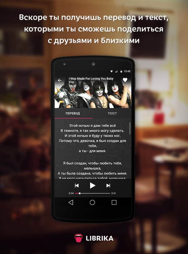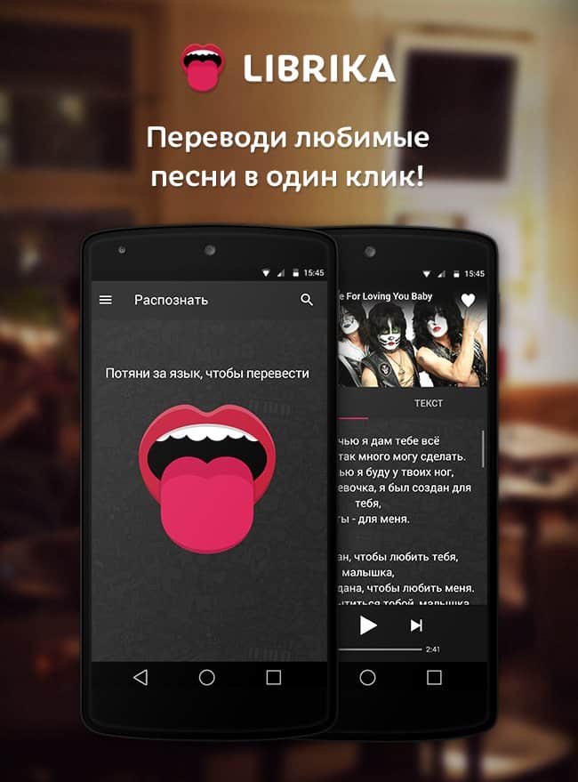 Librika – приложение, которое действительно может быть полезно для меломанов, постоянно слушающих иностранную музыку. Прослушивая в очередной раз одну из своих любимых песен, которую исполняет зарубежная группа, вы ловите себя на мысли, что не понимаете о чём идёт речь в песне. Вот теперь в игру вступает приложение которое может с лёгкостью распознать песню, и предоставить вам её перевод. С помощью этой программы все песни на иностранном языке будут восприниматься по новому и дарить вам незабываемые ощущения от прослушивания любимых треков. При желании текстом можно поделиться со своими друзьями.
